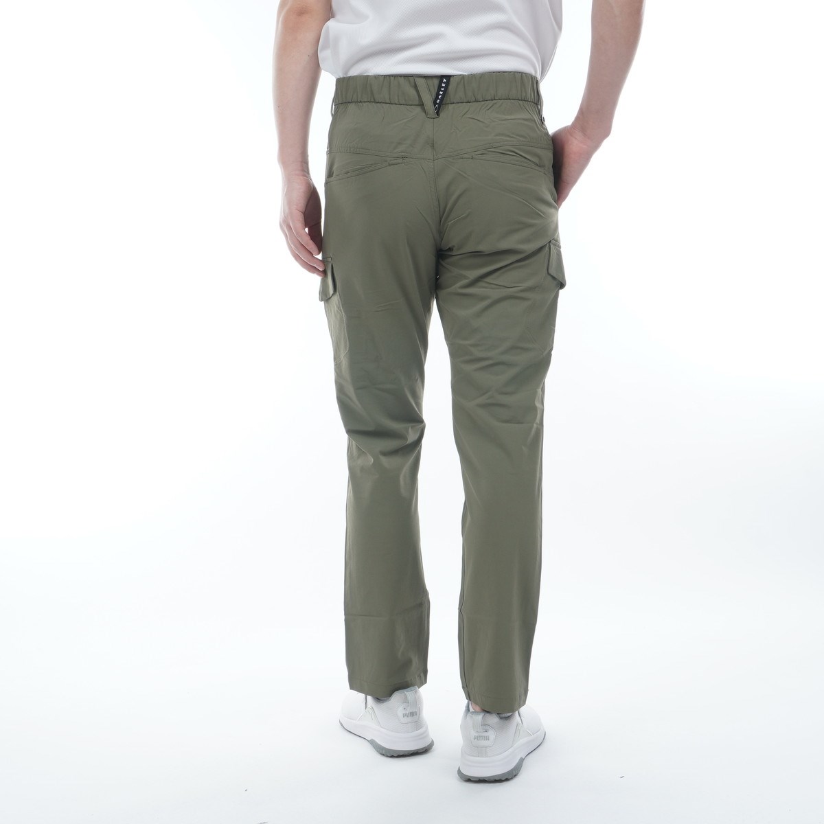 スタイリッシュに着用可能なシルエットで、右後ろベルトループにはDカンを付け利便性を考慮し、センターバックのベルトループを変形させて作ったロゴテープがデザインを引き立てる。