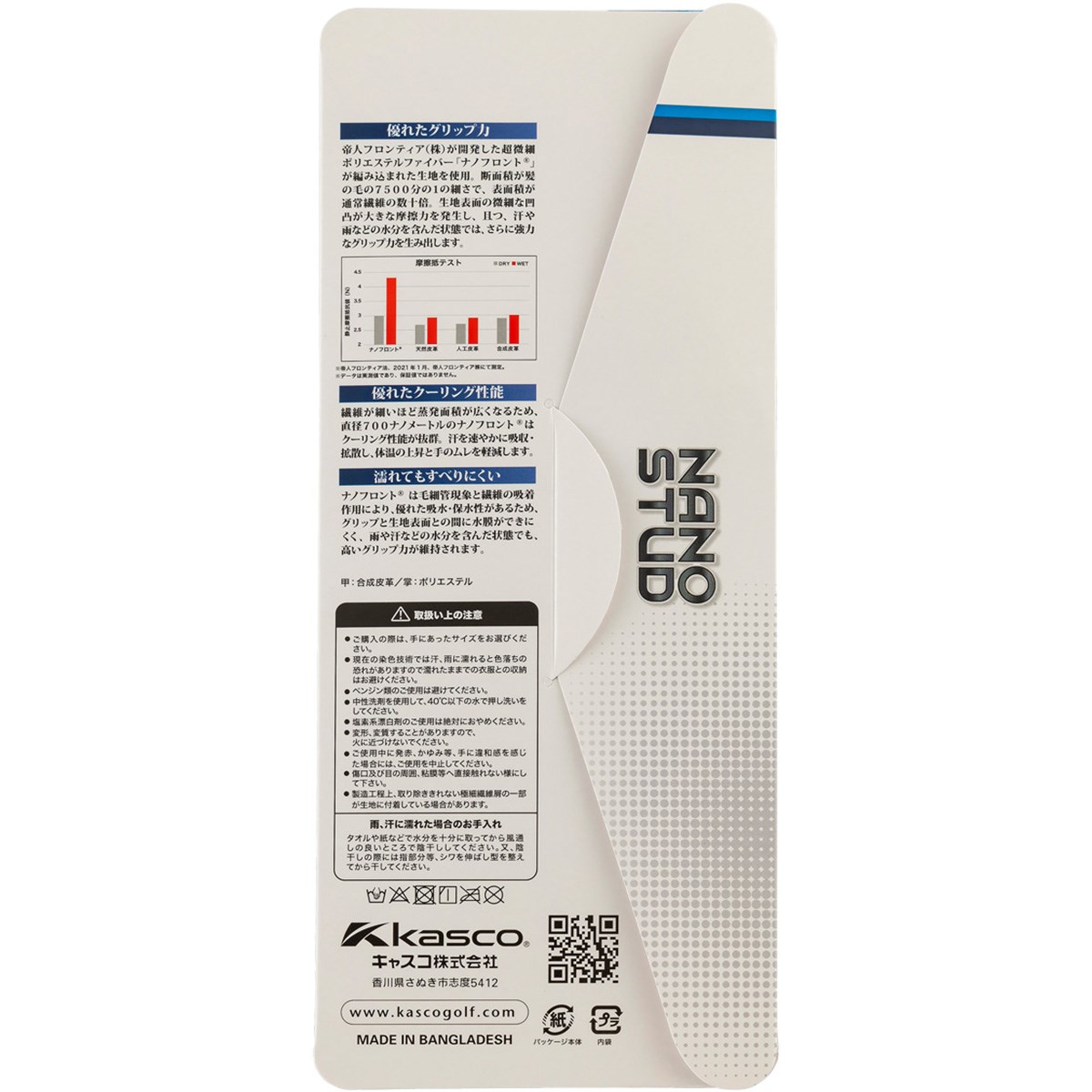 生地表面の微細な凹凸が大きな摩擦力を発生し、且つ、汗や雨などの水分を含んだ状態では、さらに強力なグリップ力を生み出す。