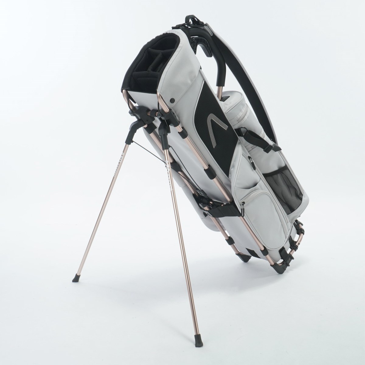 ゴルフを愛するメンバーが一丸となり、使い心地の良さを追求したキャディバッグ。軽くて頑丈なアルミフレームが車のトランクに積み重ねたときの型崩れや変形を防いでくれる。独自のワイヤー構造により、スタンドキャディバッグの開閉スイッチを底面から手元に移動。