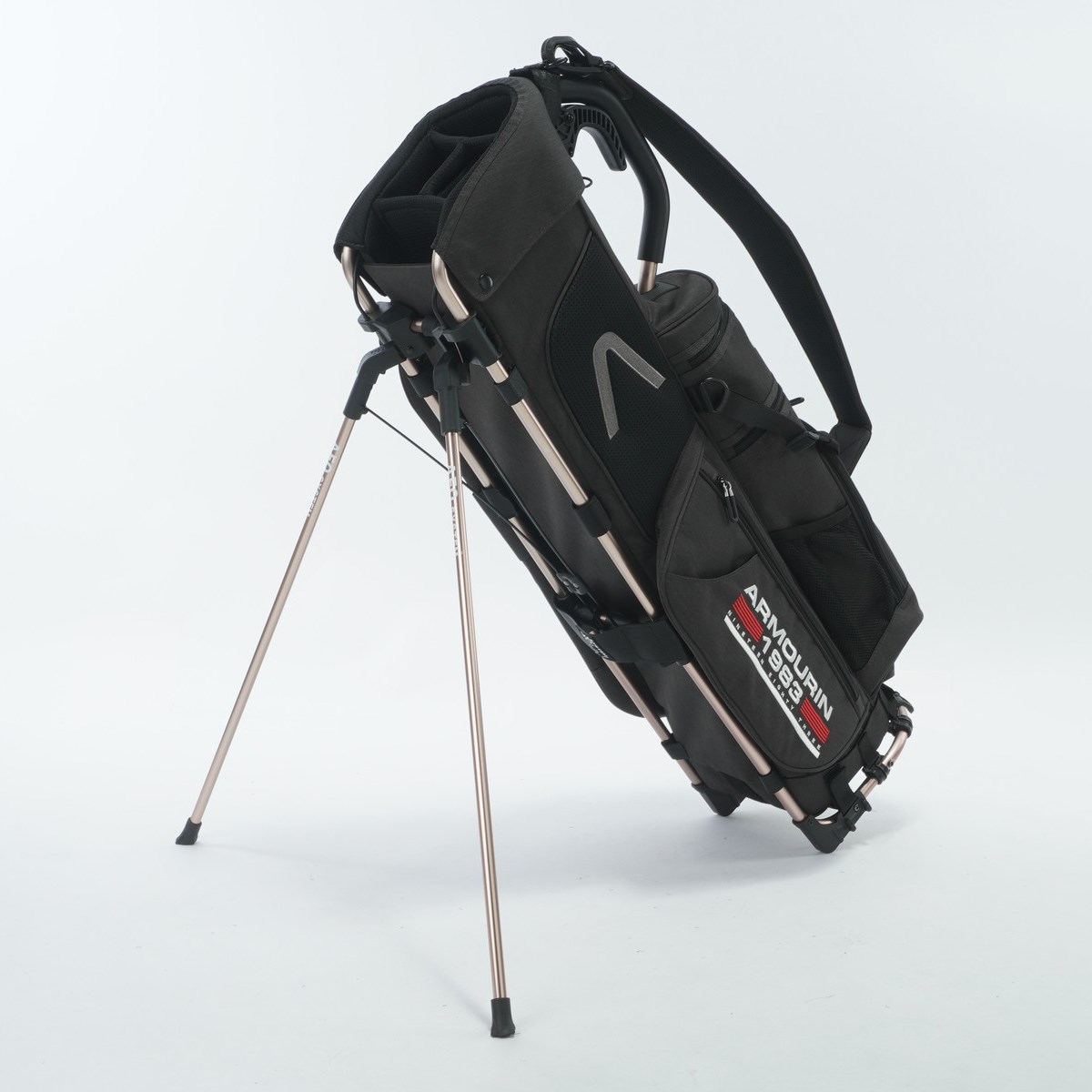 ゴルフを愛するメンバーが一丸となり、使い心地の良さを追求したキャディバッグ。軽くて頑丈なアルミフレームが車のトランクに積み重ねたときの型崩れや変形を防いでくれる。独自のワイヤー構造により、スタンドバッグの開閉スイッチを底面から手元に移動。