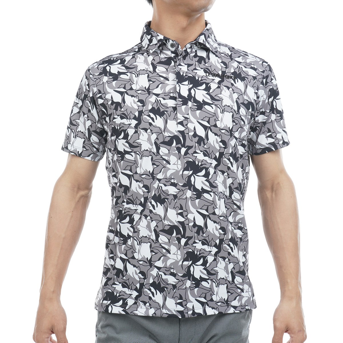 左胸に立体感のある金属調ロゴマークを施した、鮮やかな配色のリーフ柄の半袖ポロシャツ。