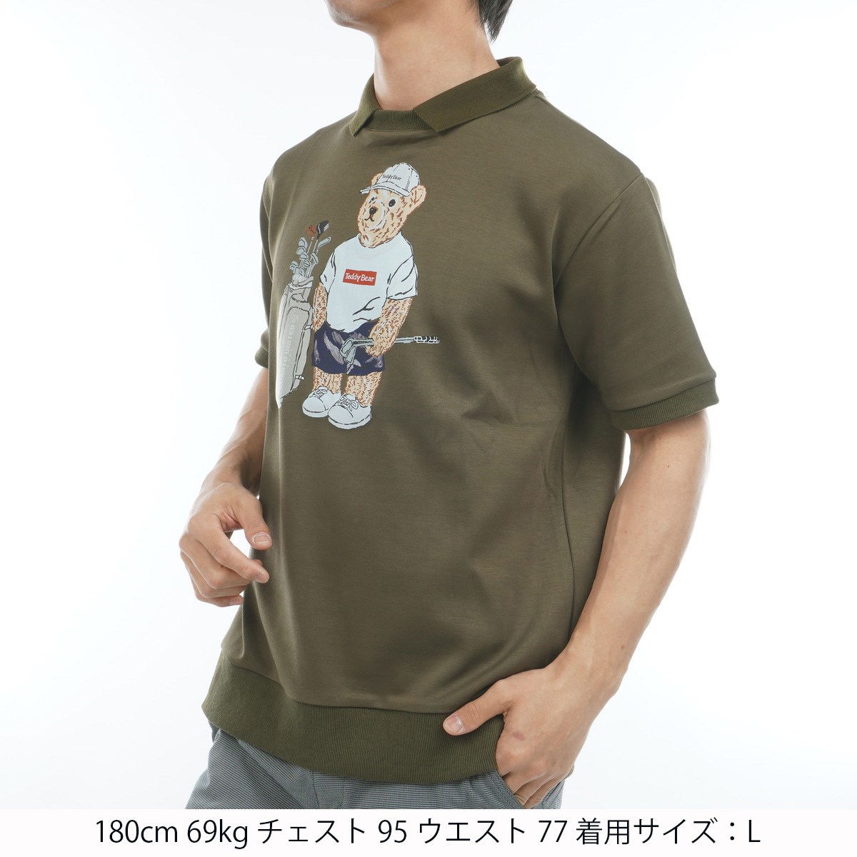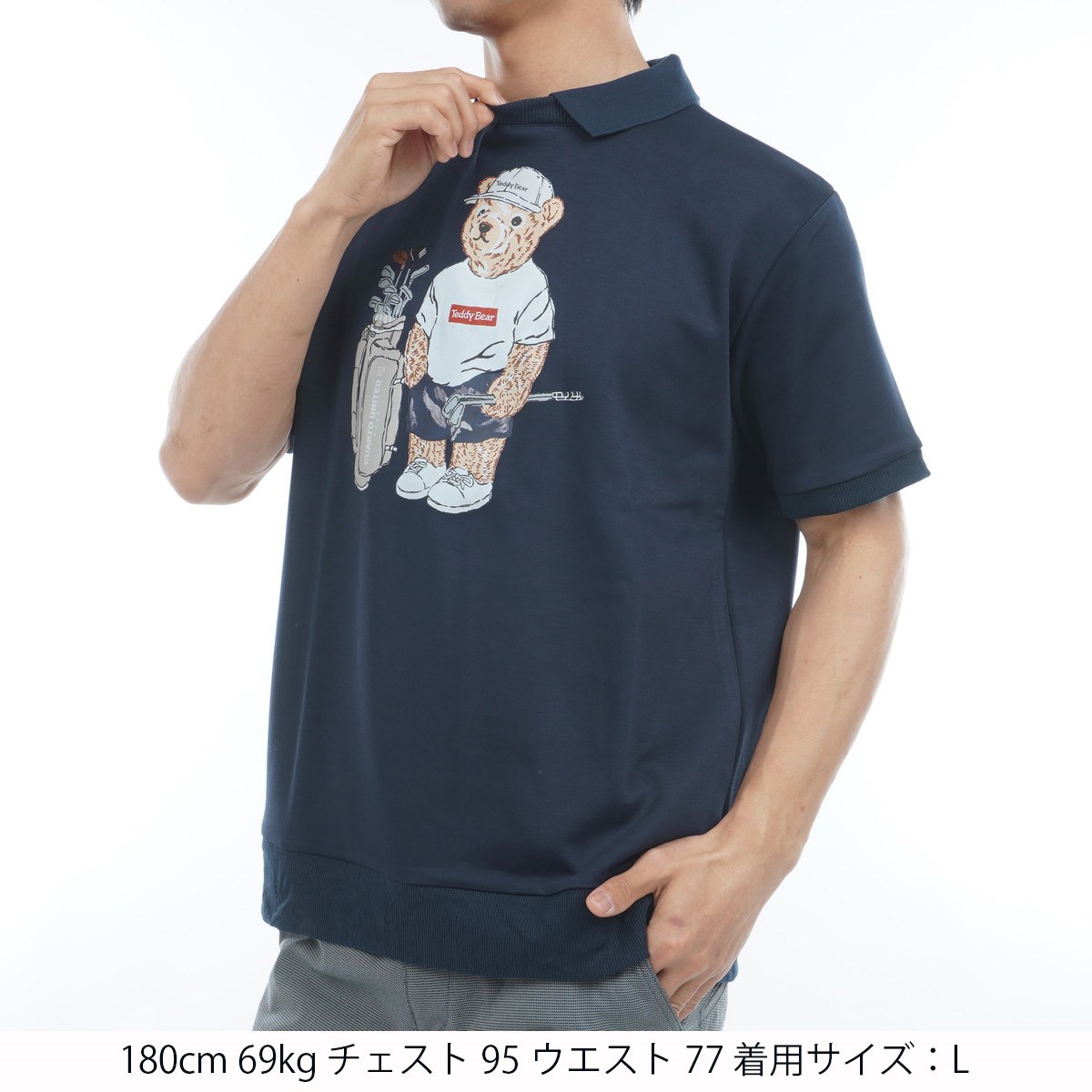 存在感のある可愛らしいクマプリントが目を惹く衿付きトップス。