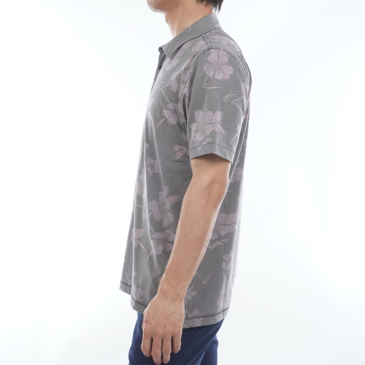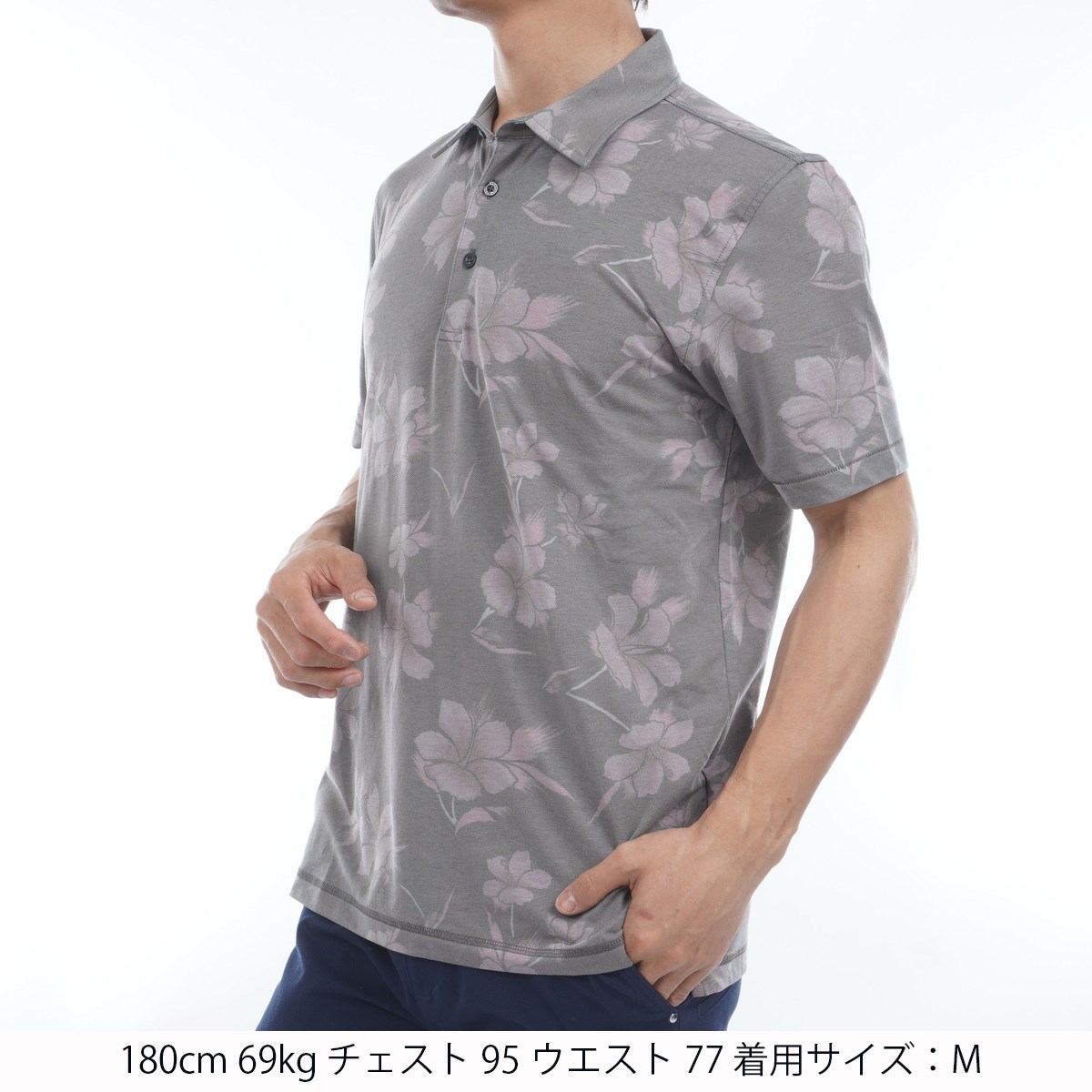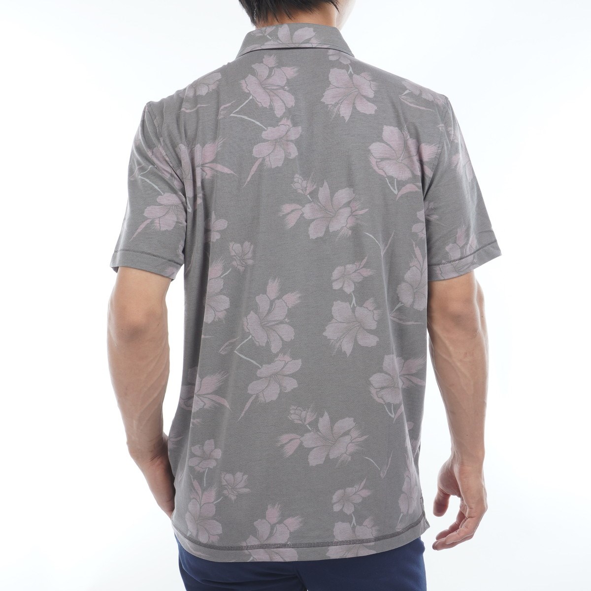 ハイビスカス柄をデザインした総柄ポロシャツ。