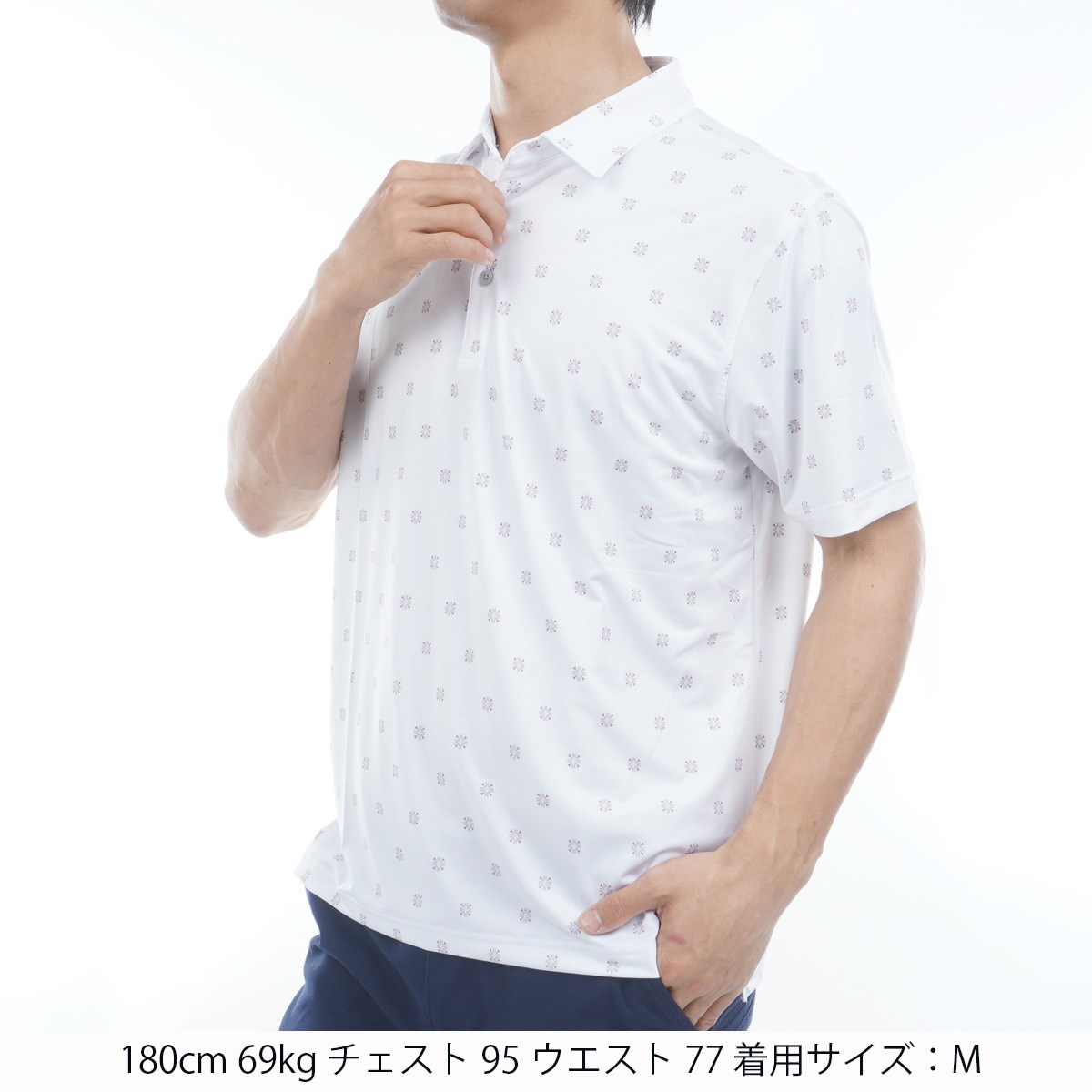アザレア(つつじ)など小花柄がデザインされた半袖ポロシャツ。