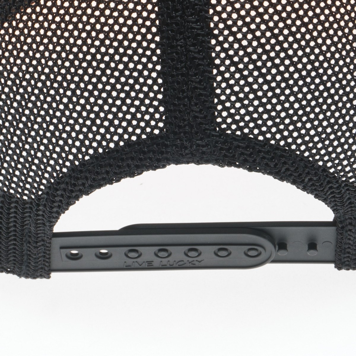 サイズ調整可能なスナップバック、ブラックのメッシュ素材など、機能性にも優れています。