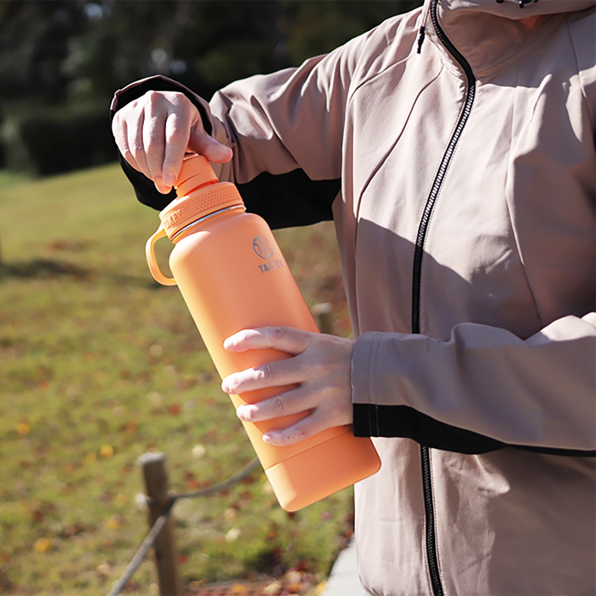 シリコーングリップで汗をかいた手でも開けやすく、しっかり閉められる構造でこぼれない。