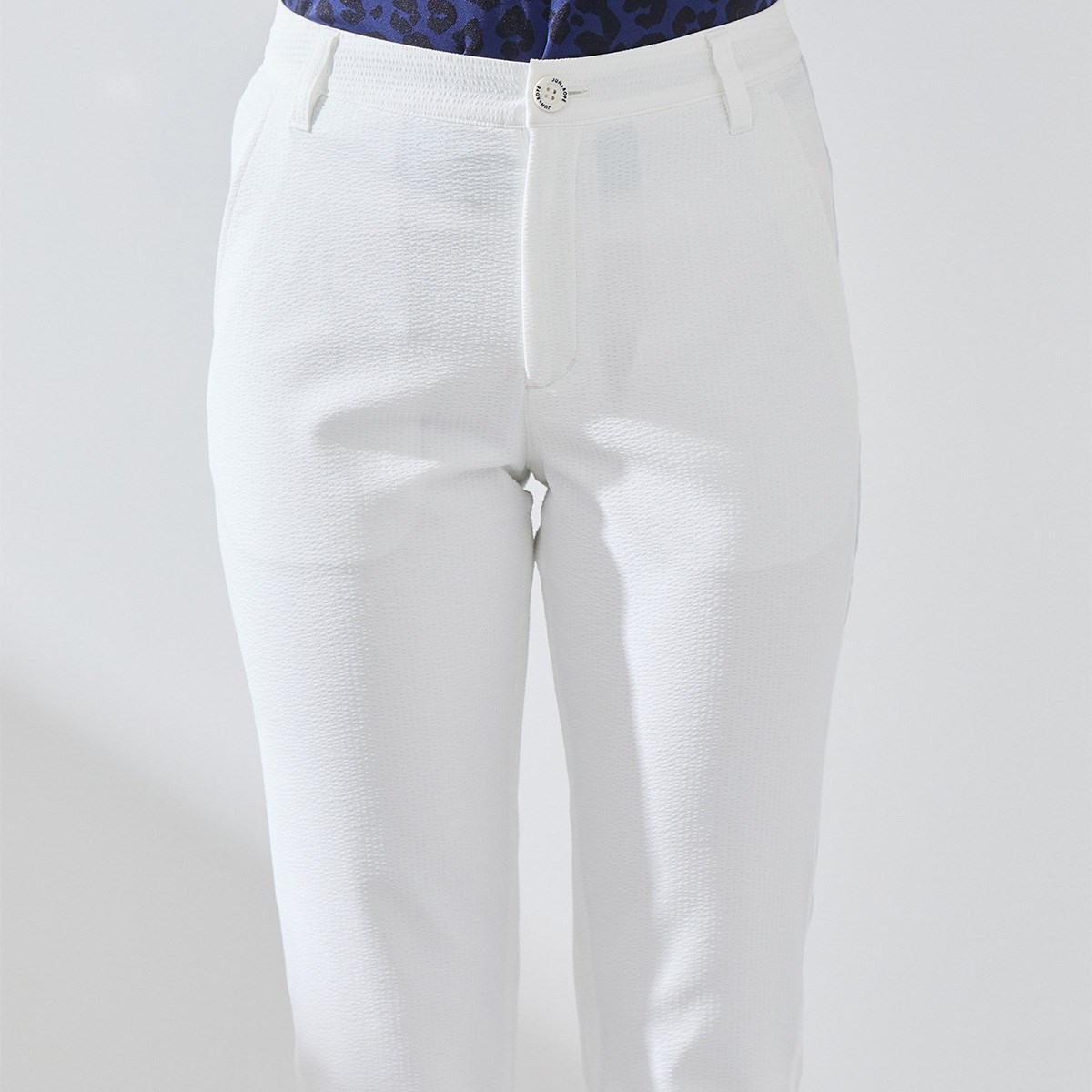 シアサッカー素材を使用したテーパードパンツ。