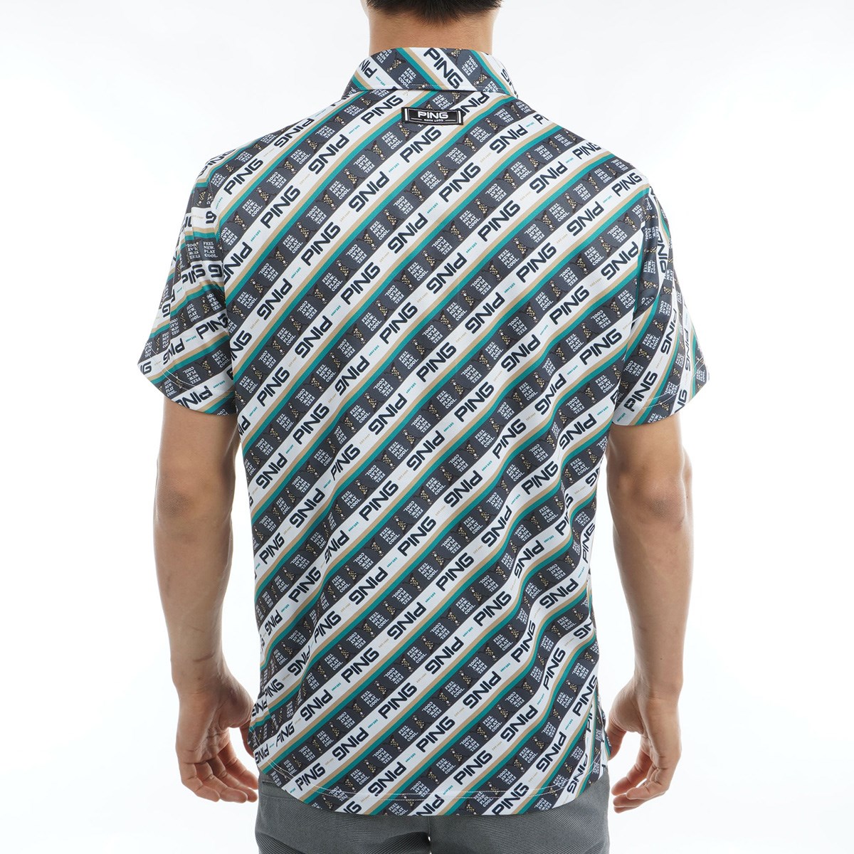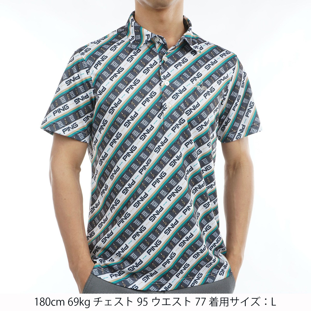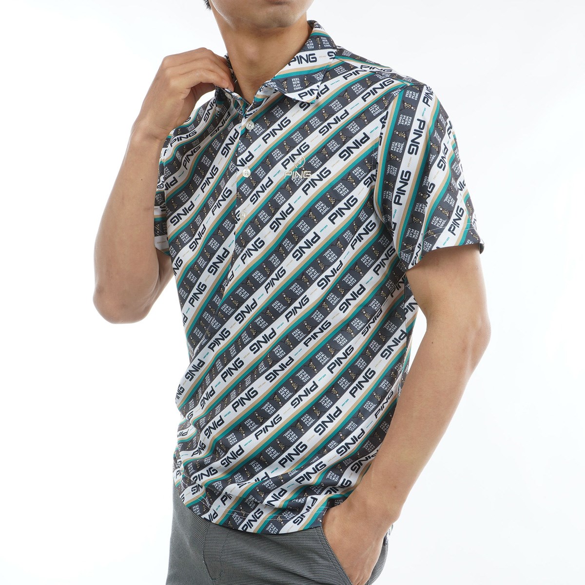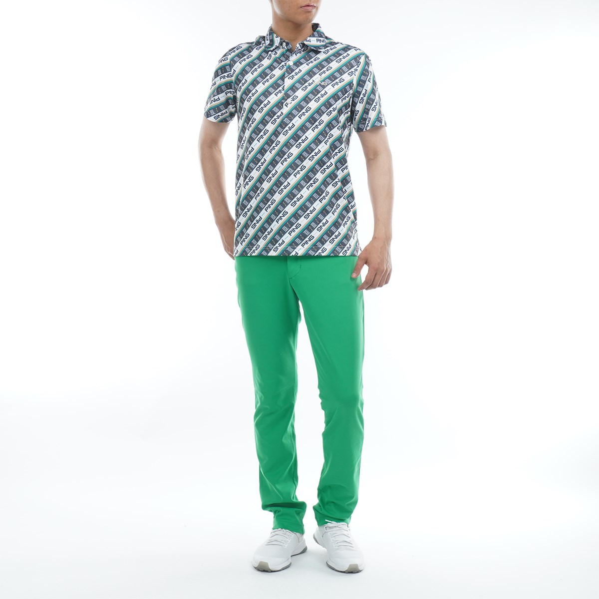 "【PING APPAREL】ロゴバイアスプリント 半袖カノコポロシャツ <NATIVE> (MENS)スタイリングに遊び心とインパクトを与える、Mr.PINGバイアスプリント半袖カノコポロシャツ。さまざまなパターンのロゴとMr.PINGを組み合わせてカラフルなバイアスプリントを表現した、パッと目を惹く半袖ポロシャツです。凸凹形状のカノコ生地は通気性と吸水速乾性に優れているので、汗をかいてもムレにくく快適な着用感を保ちます。幅広い年代の方にご愛用いただけますよう、Sサイズから4Lサイズの豊富なサイズ展開で登場しました。"アディダス EXストレッチ ACTIVE PLAY GREEN ポンチパンツ