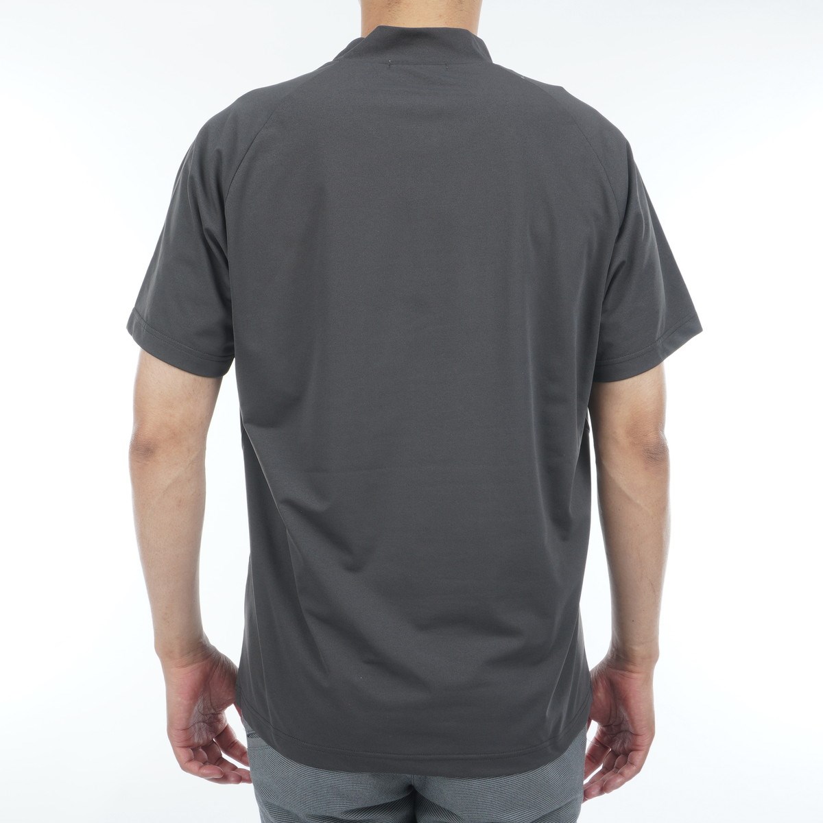 箔プリントを胸元に施したモックネック半袖シャツは、サラッとした着心地とUV機能を兼ね備えています。