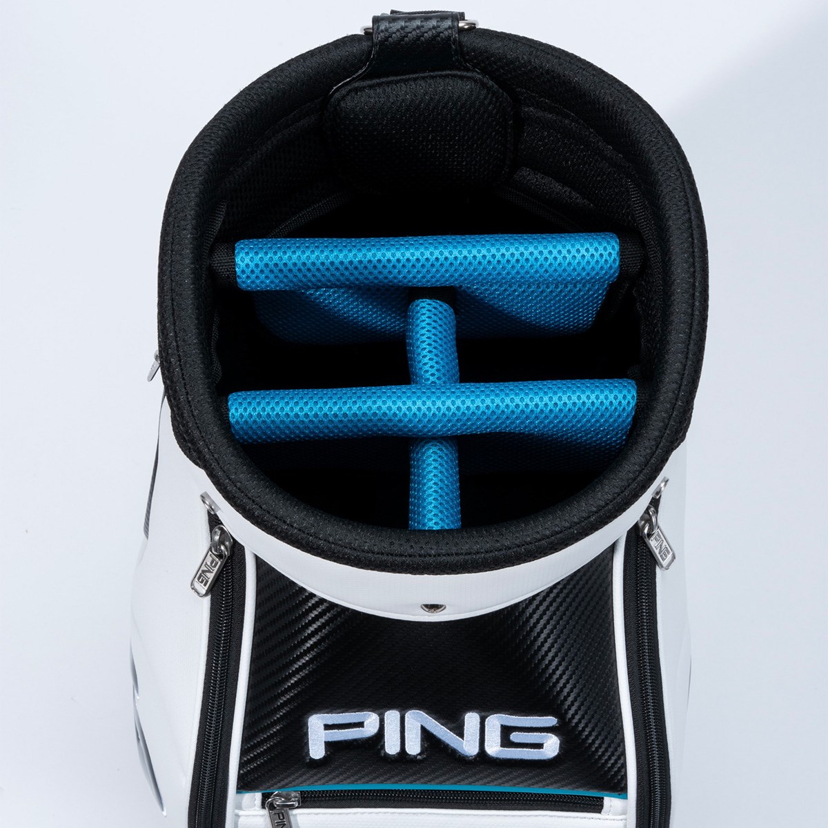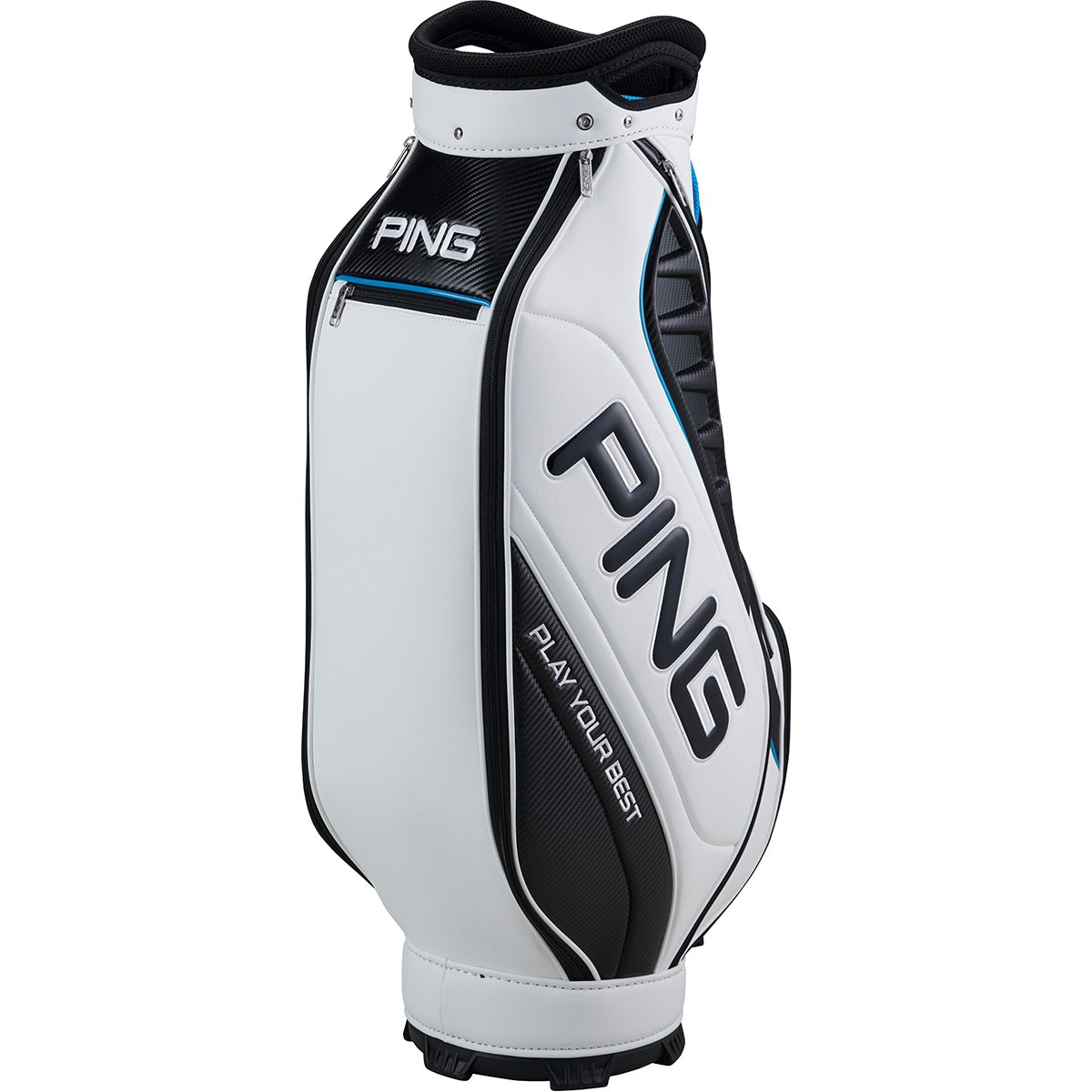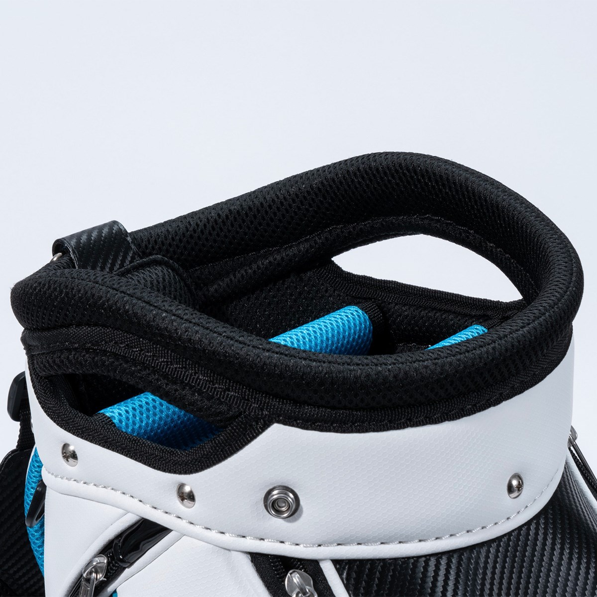・ディテール「クラブをフルセット入れた状態で持ち運びしやすい2つ穴グリップを口枠に採用。本体素材はオールポリウレタン素材を使用し、エナメル素材ロゴとの組合せで本格的なイメージを演出。ラウンド中に使用頻度の高い正面ポケットは2か所とも立体ポケットとし、収納力アップと取り出しやすさを実現。」