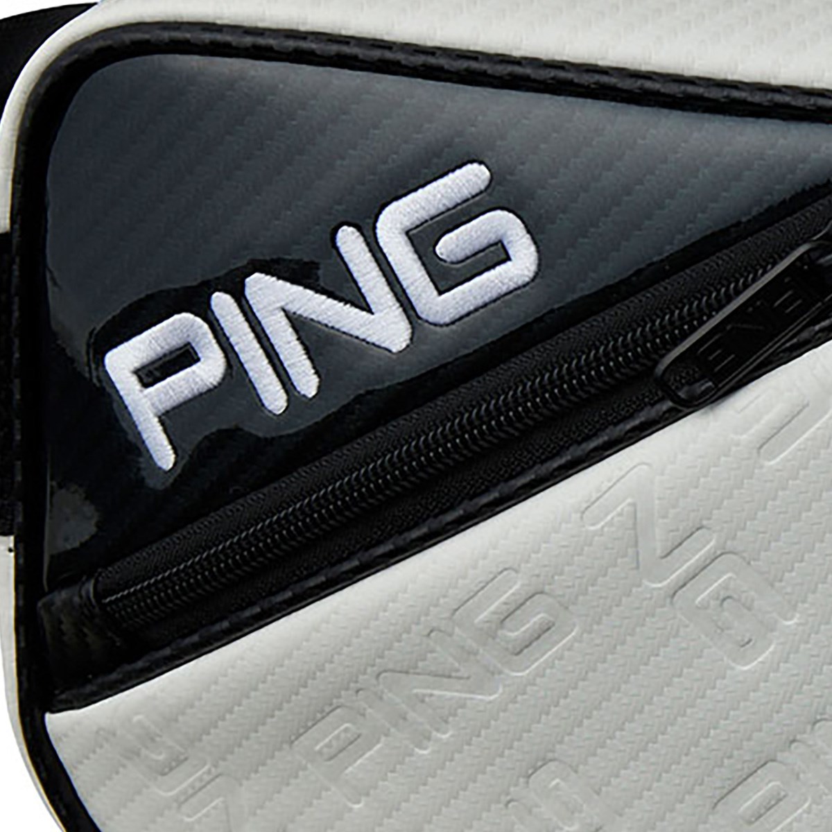 ・カーボン調のポリウレタン素材にエンボスロゴとエナメル部分使いでアクセントをつけたオーソドックスなラウンドポーチ