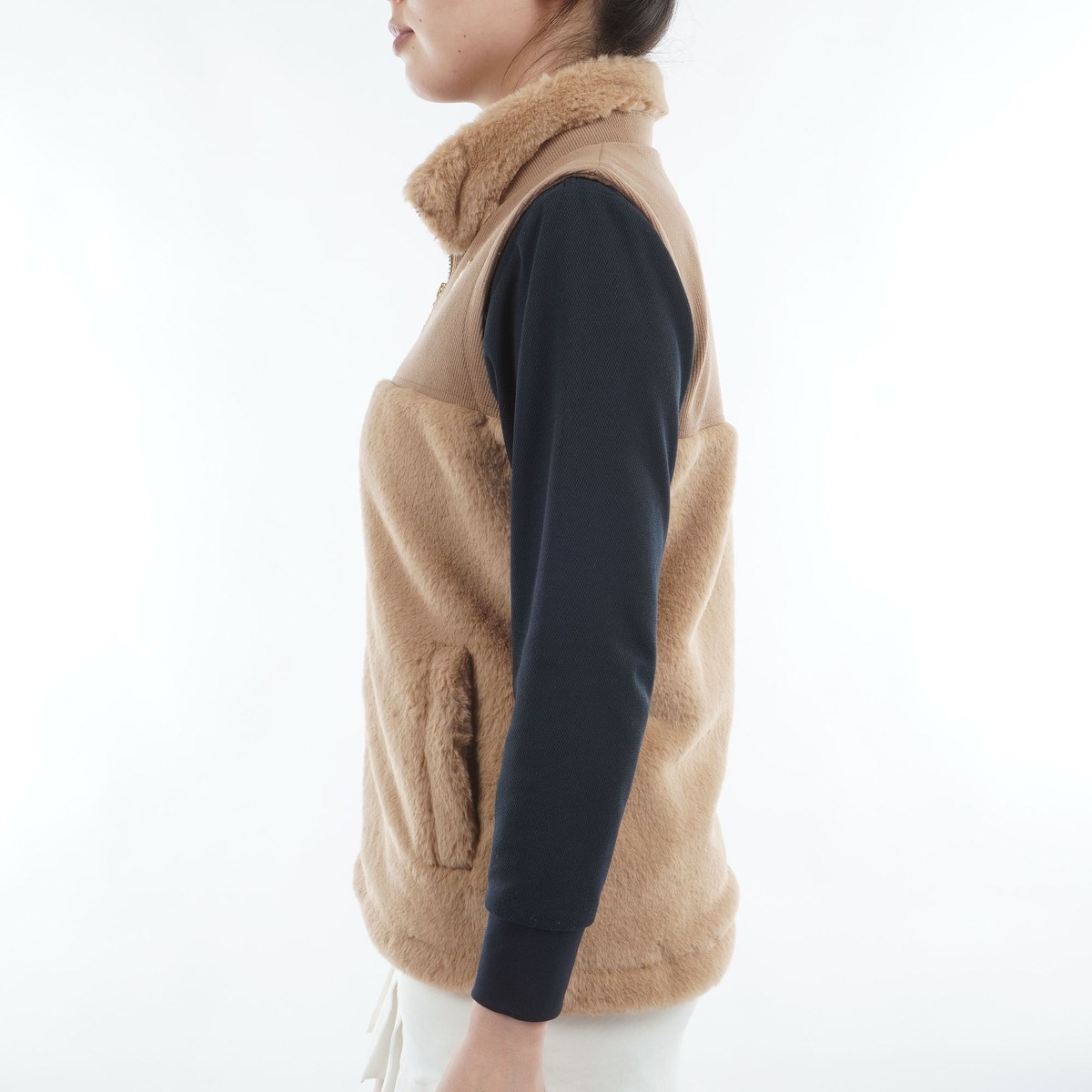 身頃の上部には、温かみとストレッチ性のあるリブ調素材を、下部にはふんわり柔らかなフェイクファーを組み合わせたデザイン。