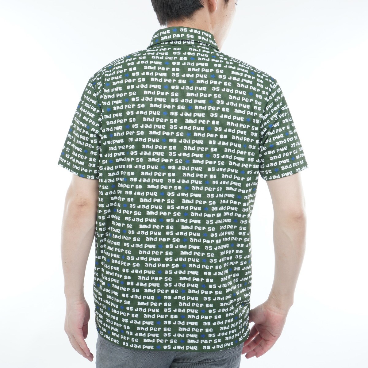 遮熱機能を持つソルケアエアリードット素材を使用した総柄プリント半袖ポロシャツ。