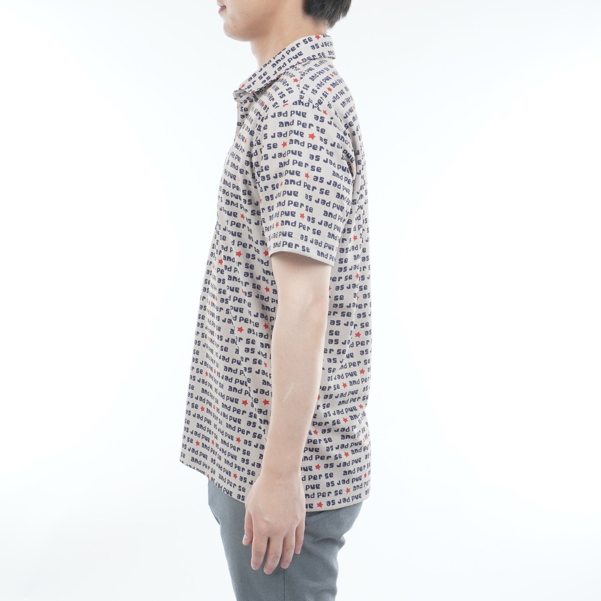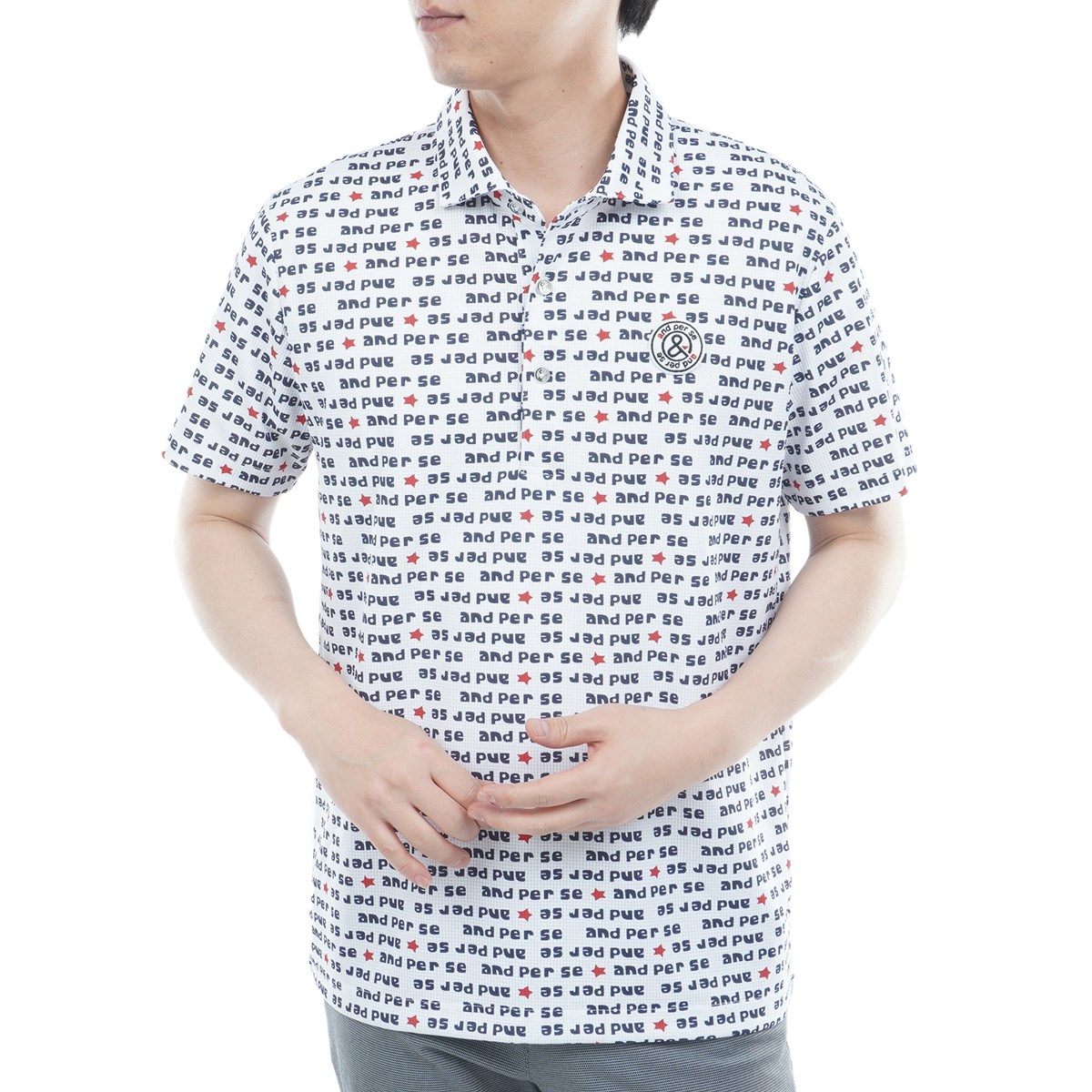 遮熱機能を持つソルケアエアリードット素材を使用した総柄プリント半袖ポロシャツ。