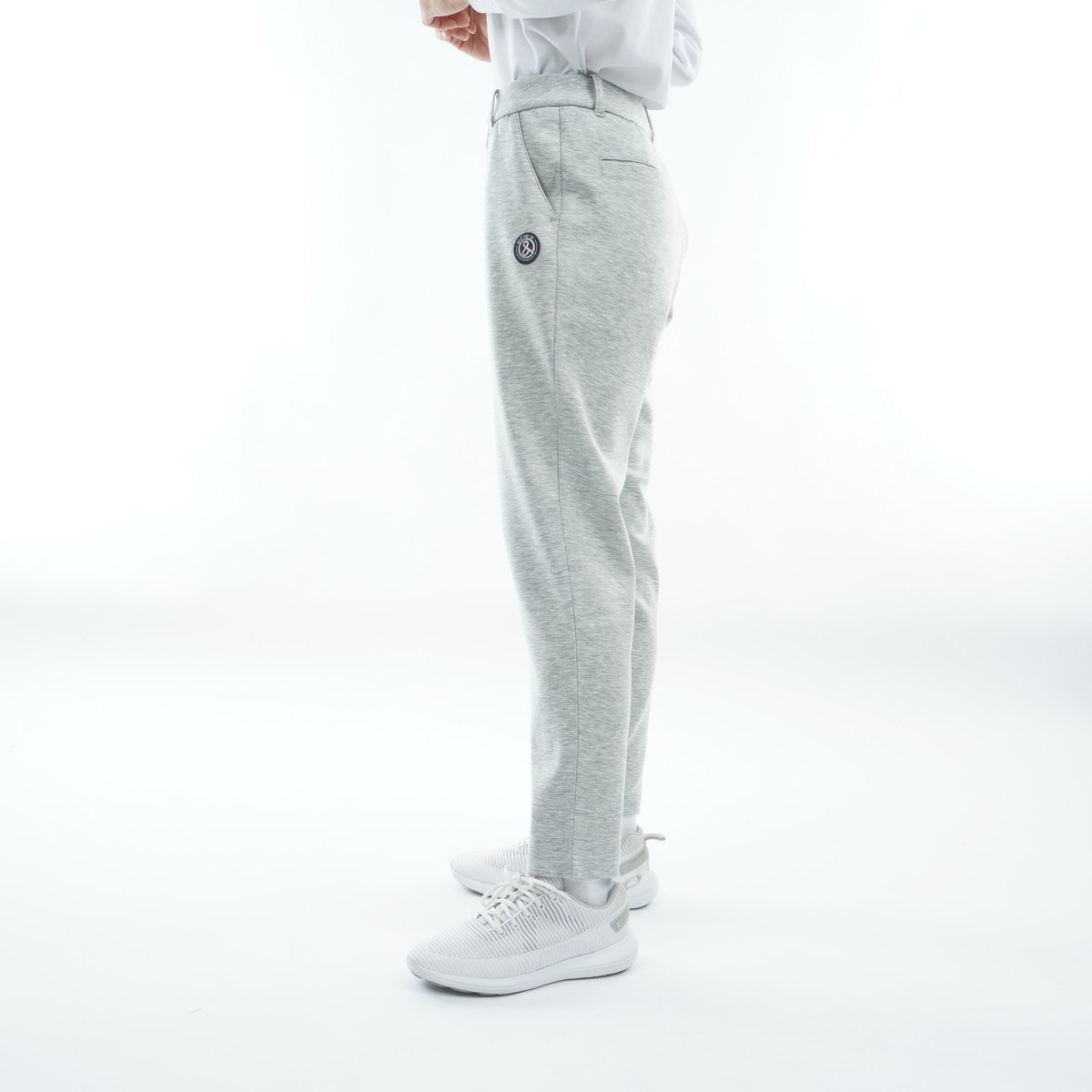 テーパードタイプのシルエットで、スウェット素材ながら、きちんと感のある着こなしを完成させます。