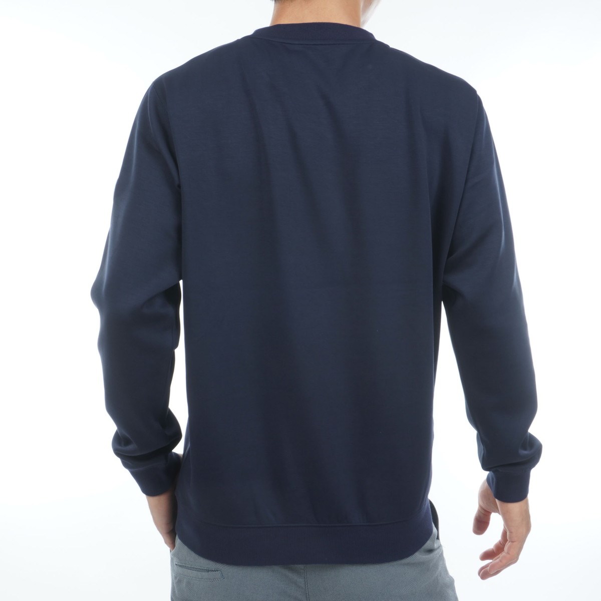 伸縮性の高さによる動きやすさと、シャツ衿ともモックネックとも合わせやすいクルーネック形状で仕上げています。