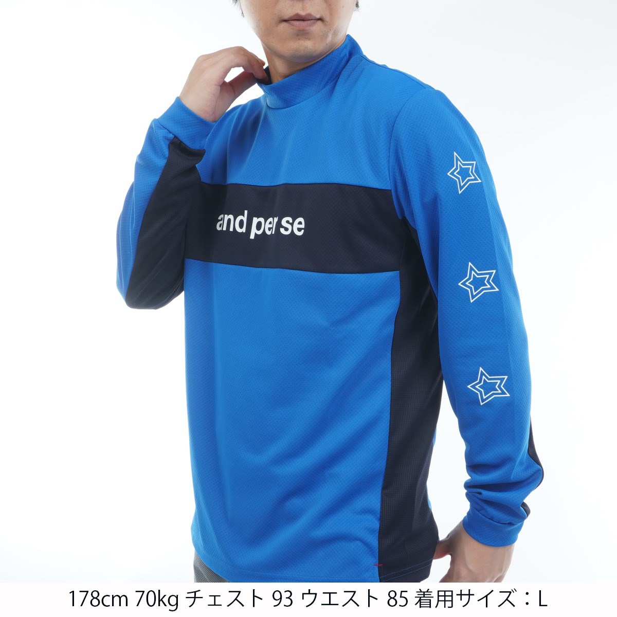 スポーティな印象の胸元切替デザインに加え、左袖部分にand per se 2025秋冬シーズンモチーフの星プリントを施しています。