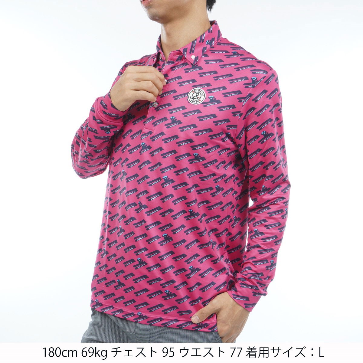 なめらかタッチの裏起毛ソフトニット素材で仕上げた総柄プリント・長袖ボタンダウンポロシャツ。