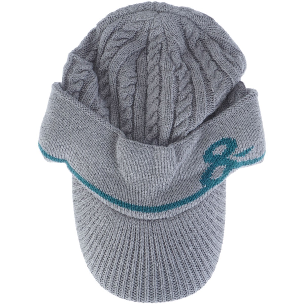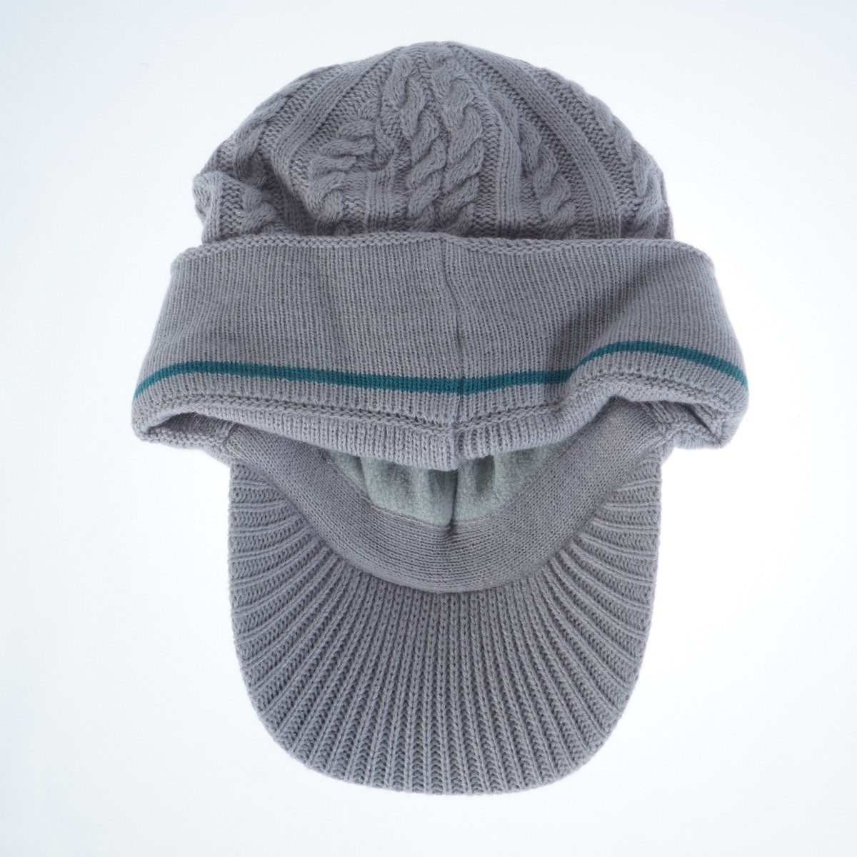 肌触りが良く保温性の高いアクリル繊維のケーブル編みニットを使用した、つば付きニットキャップです。