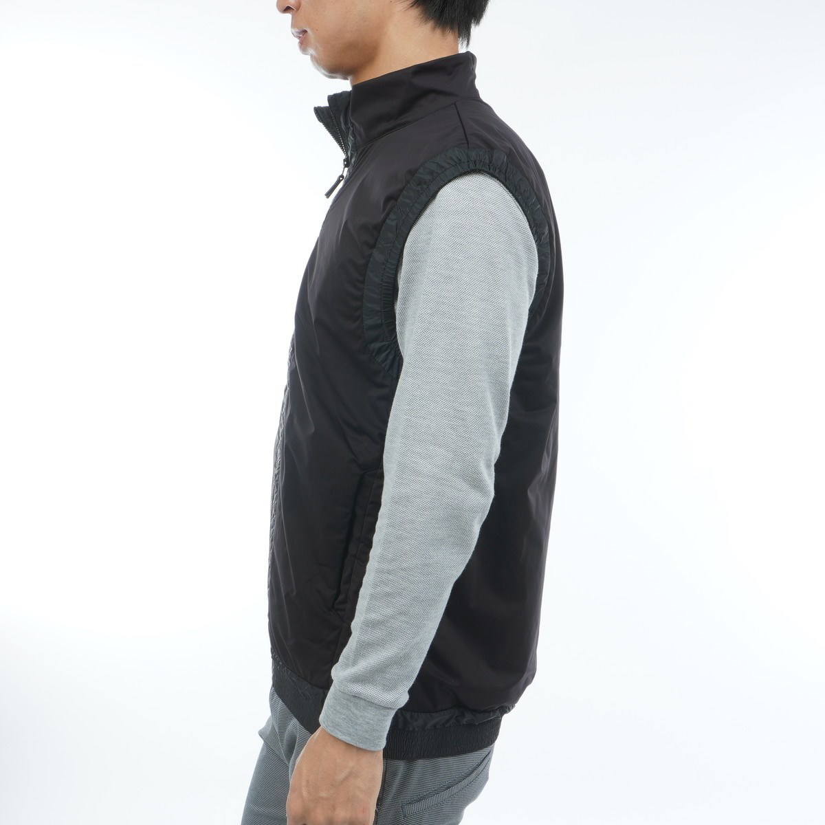 &GOLFの代表する日本製ハイゲージカットソー素材46Gサイレントマルチウェイの裏側に、保温中綿の機能を果たす起毛形状メッシュ素材を加えたエアロ2レイヤー素材の極薄保温ベスト。