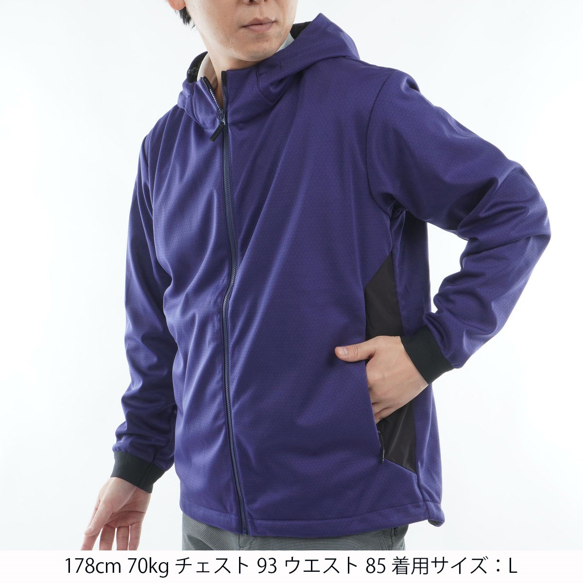 裏側のグリッド構造マイクロフリースが「高い保温性」と「ウォーム&ライトな肌触り」を実現する、透湿防水ストレッチ3レイヤー(ソフトシェル)素材を採用したフルジップブルゾン。