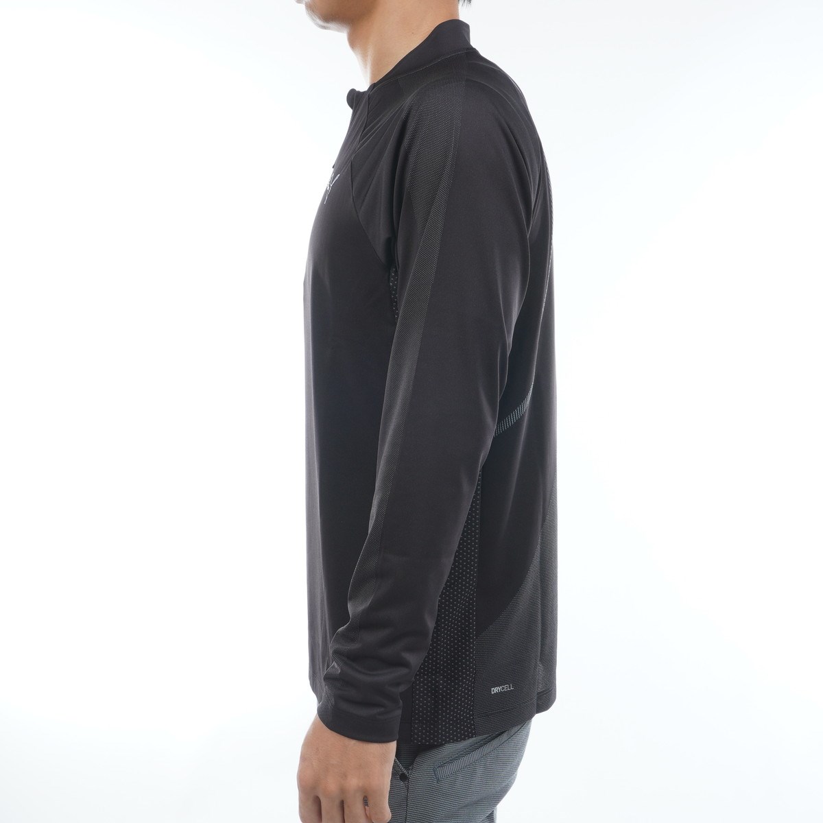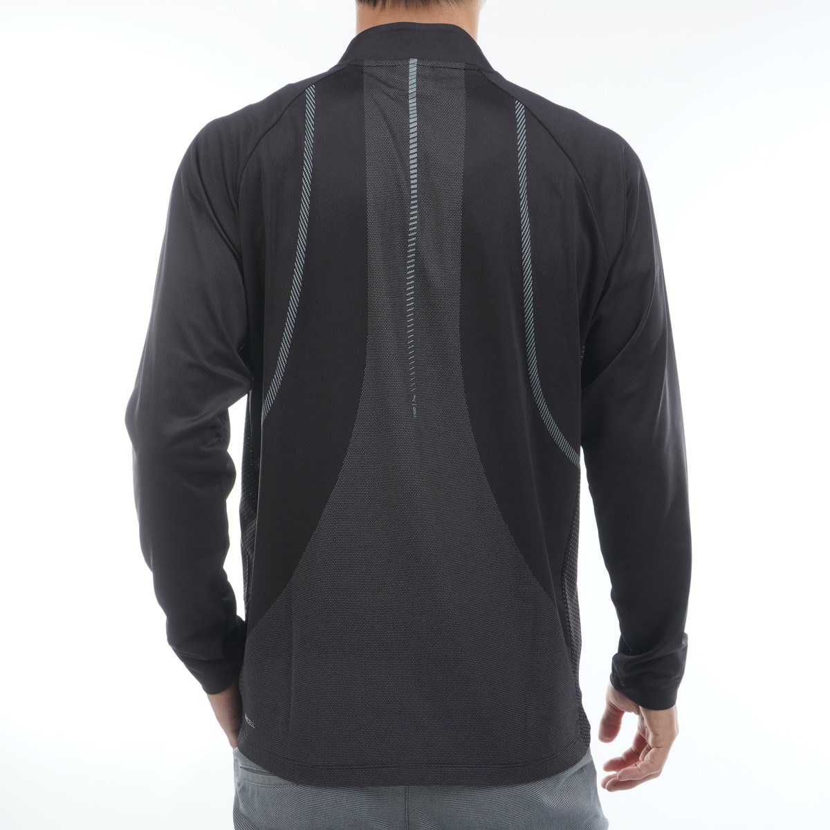 袖のT7ラインや背中の大きさの異なるジャカードメッシュで表現した軽量ハーフジップモックネック長袖シャツ。