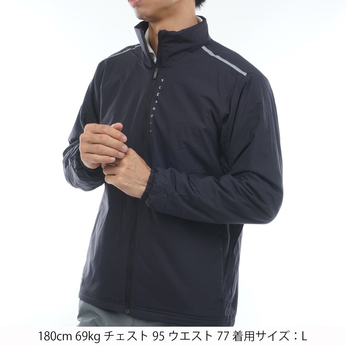 シンプルなPUMA GOLFのロゴグラフィック、肩の圧着ラインがアクセントになったスポーティーなデザイン。