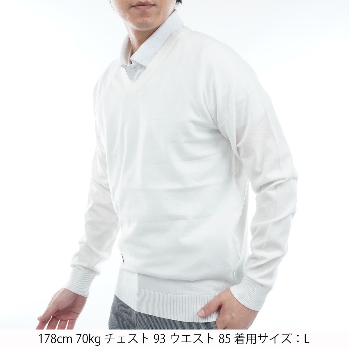 3シーズン使用できる何にでも合わせやすい、シンプルで軽量に拘ったVネックセーター。
