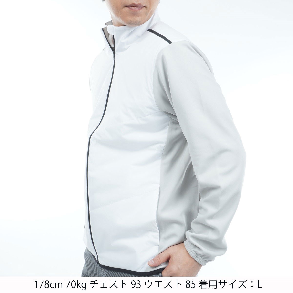 衿と前身に軽量中綿、袖と後ろ身頃に伸縮性のあるダンボールニットを使用したスポーティーなハイブリッドジャケット。