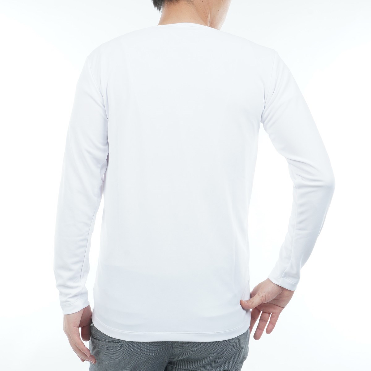 遮熱、吸水速乾、UV機能のある素材を使用し、前肩にベンチレーションテープを施したシンプルな長袖アンダーシャツ。