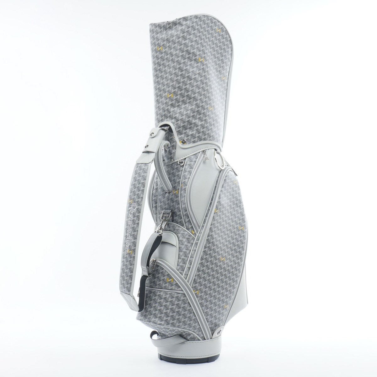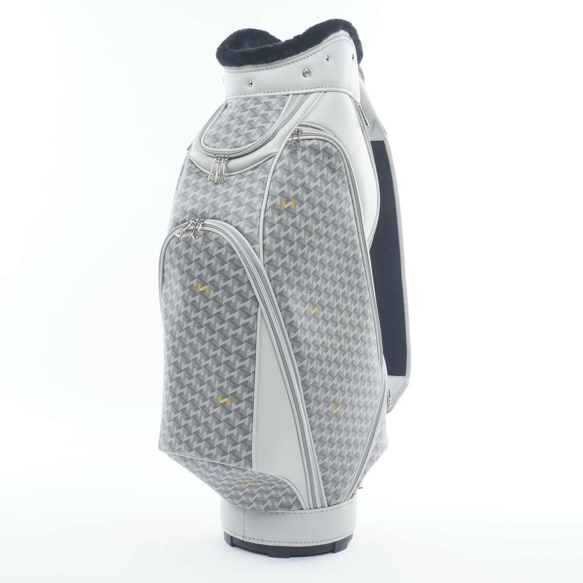 中心にはブランドロゴをあしらい全体的に角を出したデザインの金属パーツが加わることで、キャディバッグの雰囲気がグッと引き締まり、一気に高級感がアップ致しました。