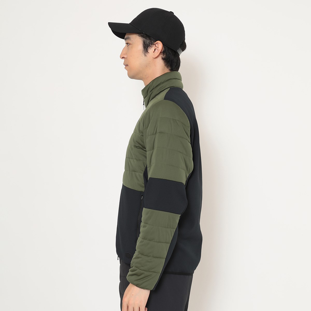 前身と袖などにスターストレッチ素材、後身と前身下などには裏面起毛のフリースと、異素材をハイブリッドさせたミドラーです。