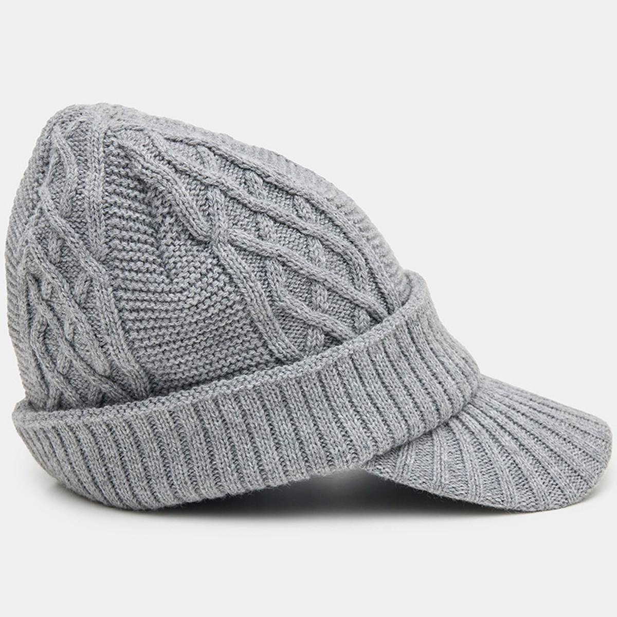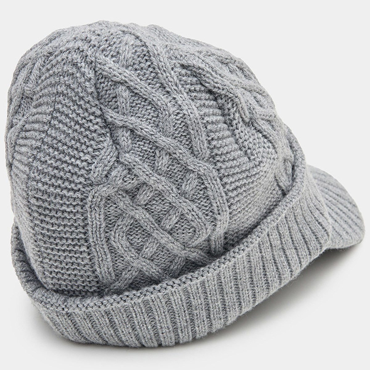 シンプルながらも表情のある編みが特徴の庇付きニットキャップ。