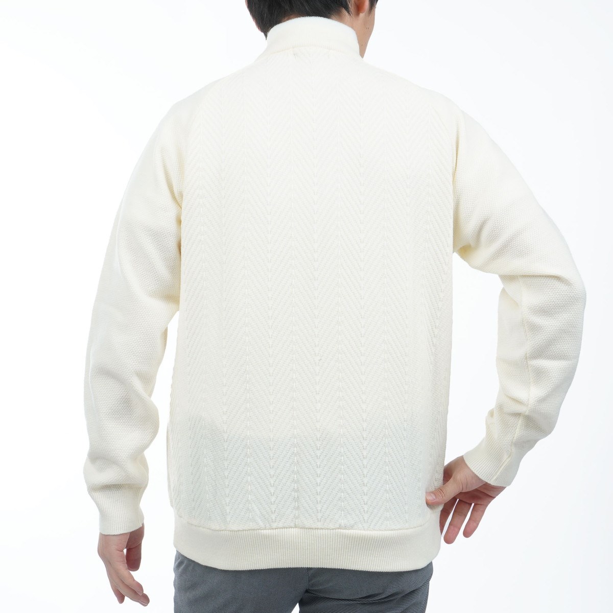 風合いある袖の編地や後身のトラッドなヘリンボーン柄が高級感もあるデザイン性の高いブルゾンです。