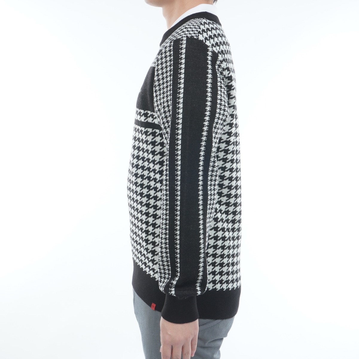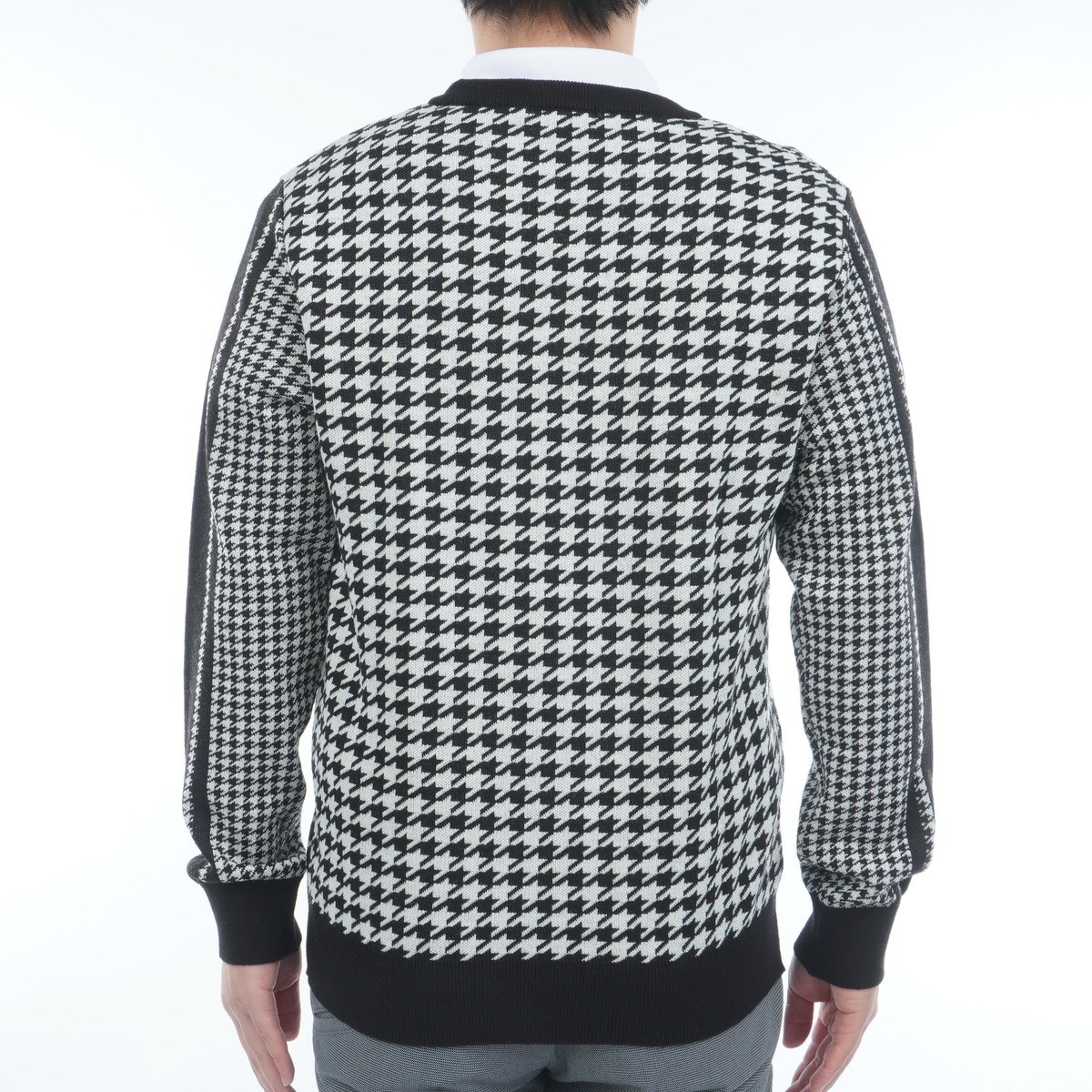 胸元とショルダーラインには無地配色を合わせ、パーツごとに変化を付けた千鳥柄のサイズコントラストが特徴的なデザインです。