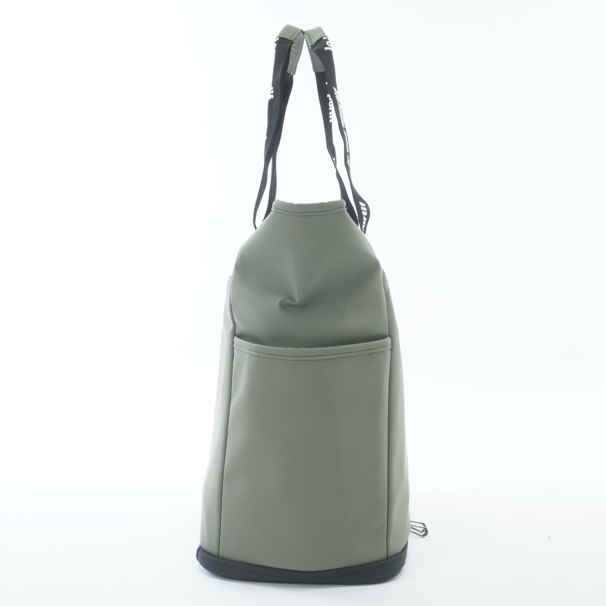 シューズ収納部をコンパクトに仕上げたマットポリウレタン素材のトートバッグ。