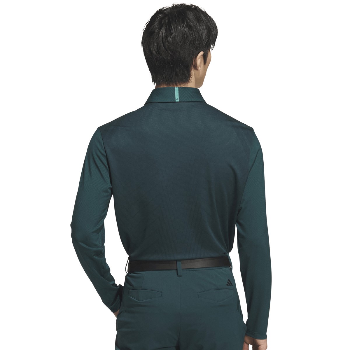 ストレッチ性の高い素材を使用した後身頃にジャガードデザインをほどした長袖ポロシャツ。