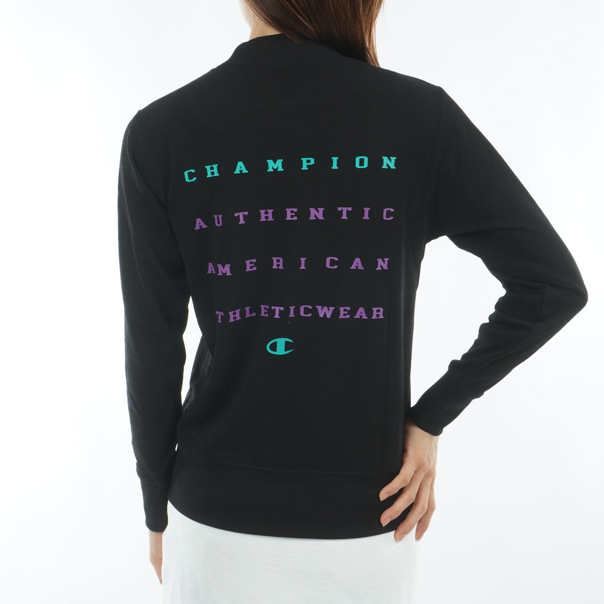 左胸に入れた縁取りのあるChampion®(チャンピオン)ロゴは刺繍で、背中の「CHAMPION」、「AUTHENTIC AMERICAN ATHLETICWEAR(オーセンティック アメリカン アスレチックウェア)」とCロゴでデザインした大胆なグラフィックはラバープリントで入れています。
