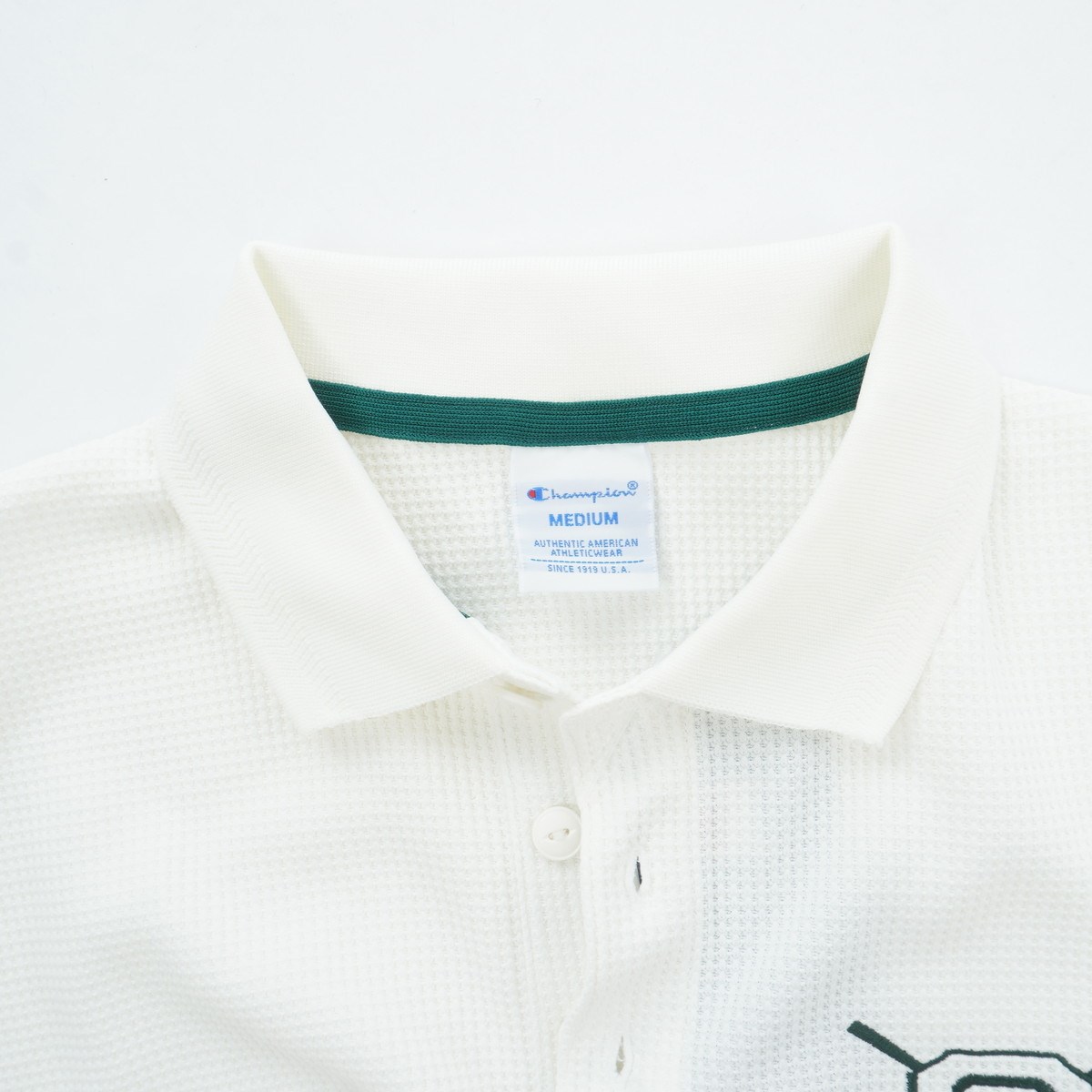 部分的に柄を織り込んだ襟がデザインポイントで、左胸にはカレッジ風の書体によるChampion®(チャンピオン)の「C」、「CHAMPION」とゴルフクラブのイラストを組み合わせたグラフィックを刺繍しています。