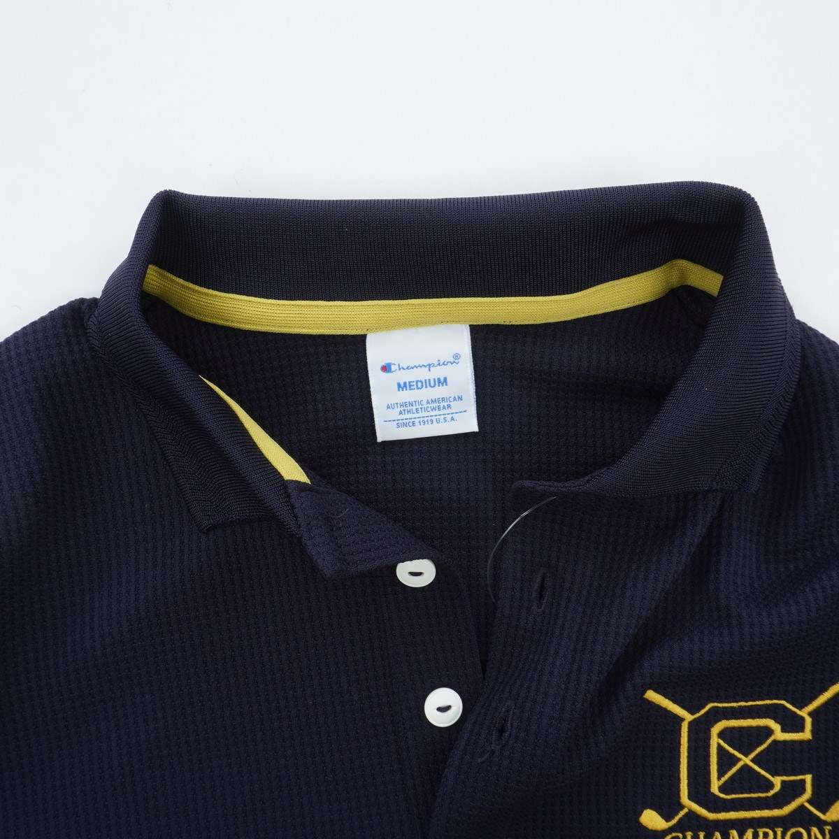 部分的に柄を織り込んだ襟がデザインポイントで、左胸にはカレッジ風の書体によるChampion®(チャンピオン)の「C」、「CHAMPION」とゴルフクラブのイラストを組み合わせたグラフィックを刺繍しています。