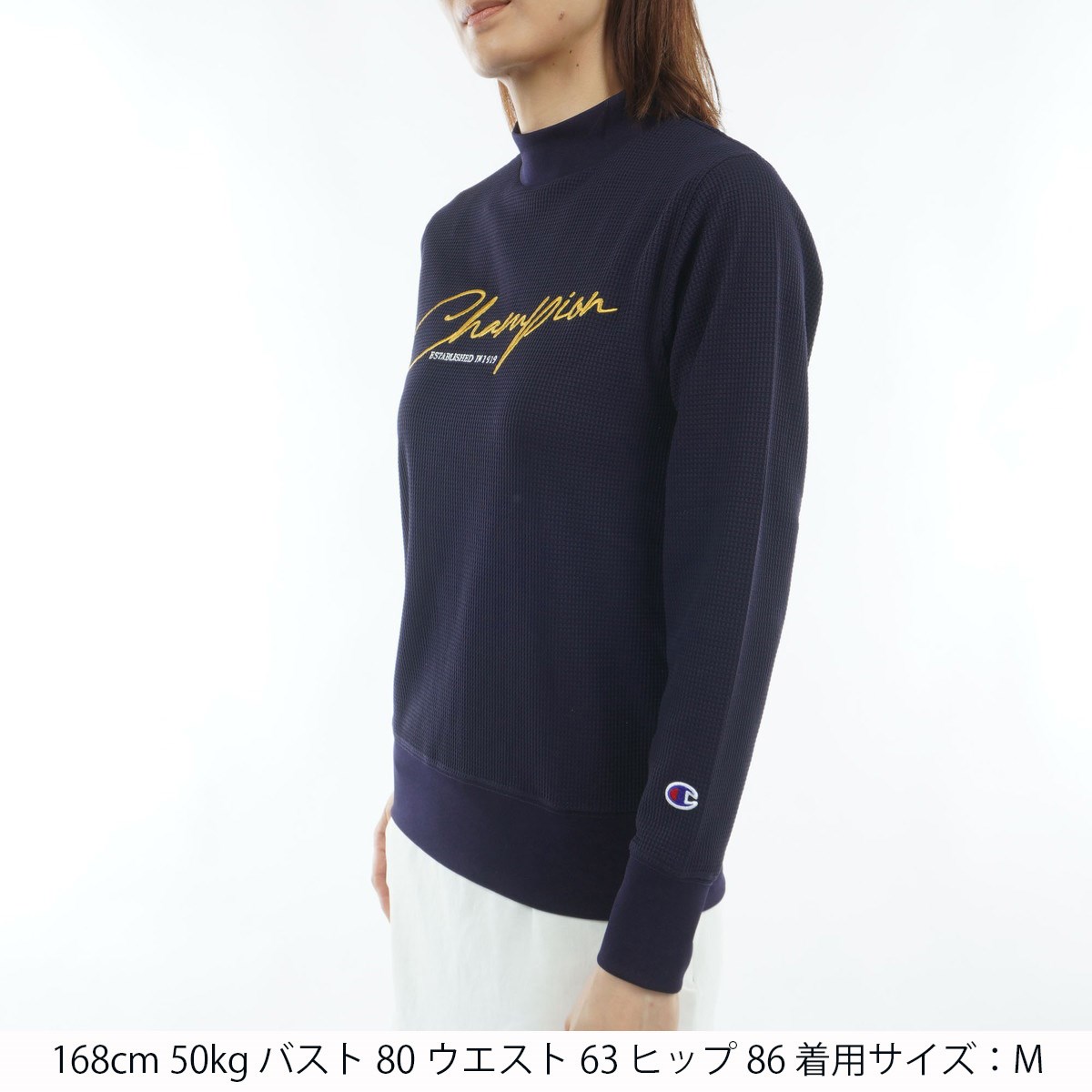 胸には筆記体による「Champion(チャンピオン)」と「ESTABLISHED IN 1919」を刺繍しています。