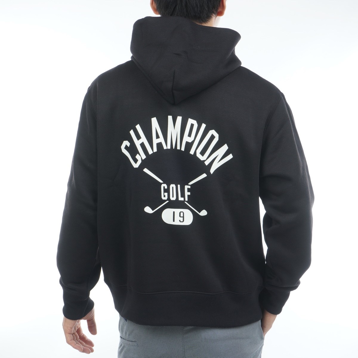 背中にはカレッジ風の書体による「CHAMPION」、「GOLF」、ブランド創業年である1919年を表す「19」とゴルフクラブのイラストを組み合わせたグラフィックをラバープリントで大胆に入れています。