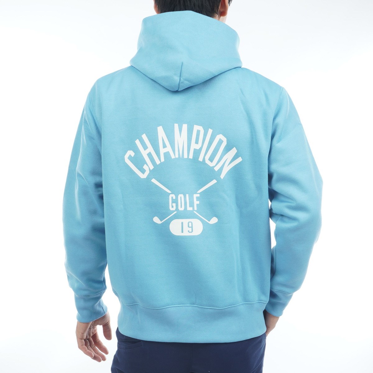背中にはカレッジ風の書体による「CHAMPION」、「GOLF」、ブランド創業年である1919年を表す「19」とゴルフクラブのイラストを組み合わせたグラフィックをラバープリントで大胆に入れています。