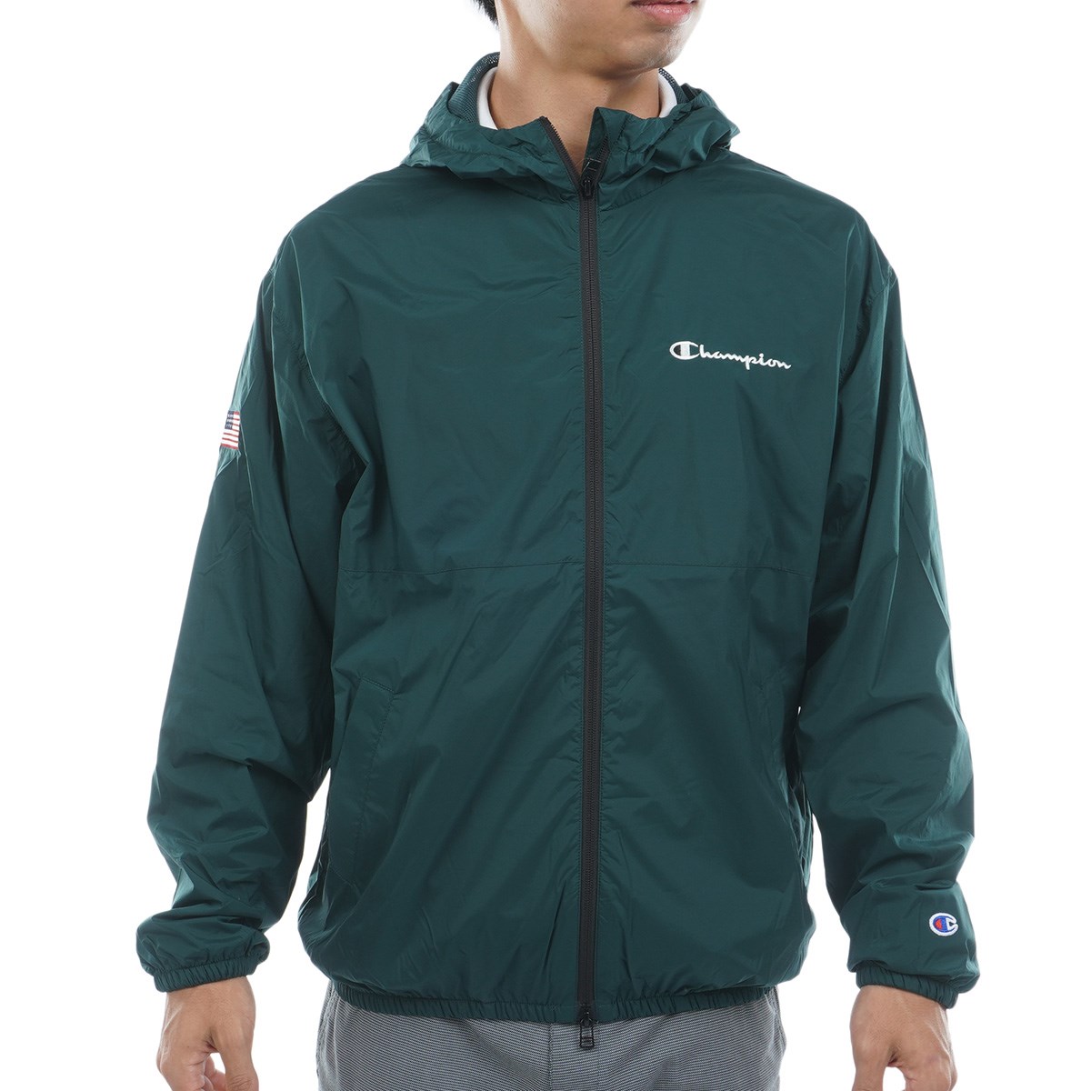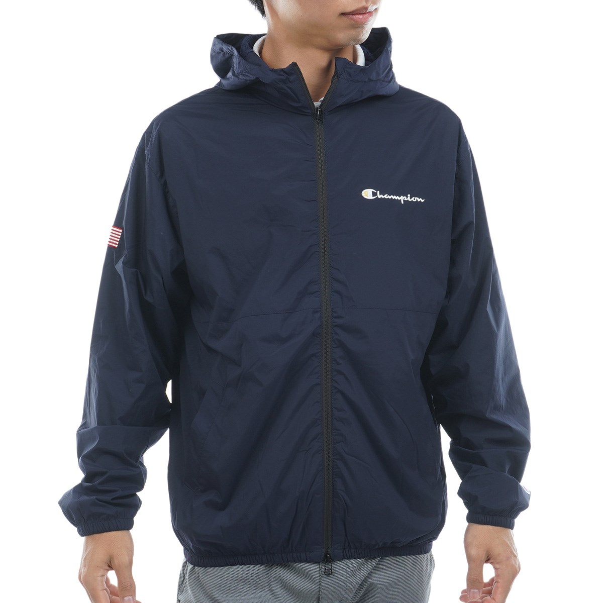 左胸にはChampion®(チャンピオン)ロゴを、右袖にはアメリカ国旗柄を刺繍しています。