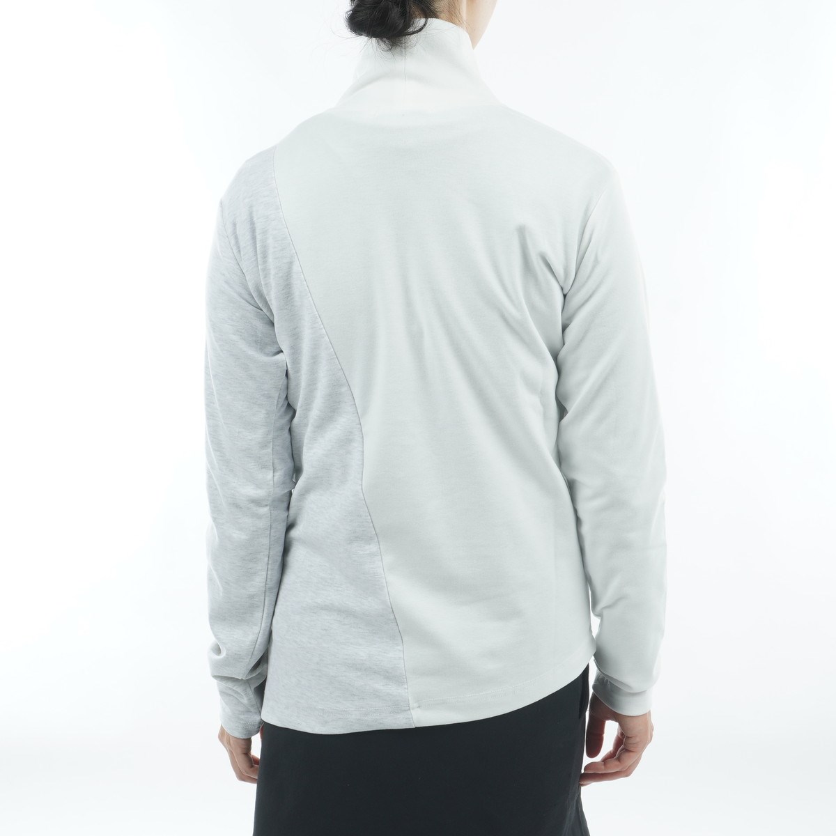 ニュアンス配色の大胆な切り替えがポイントのモックネックプルオーバー。