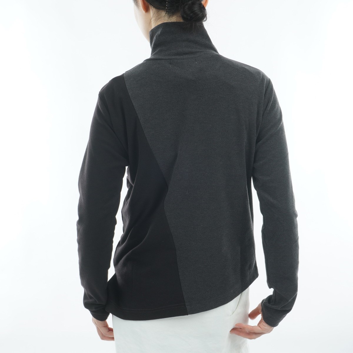 ニュアンス配色の大胆な切り替えがポイントのモックネックプルオーバー。