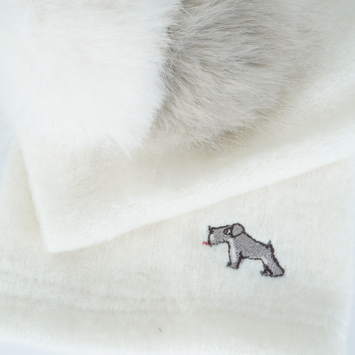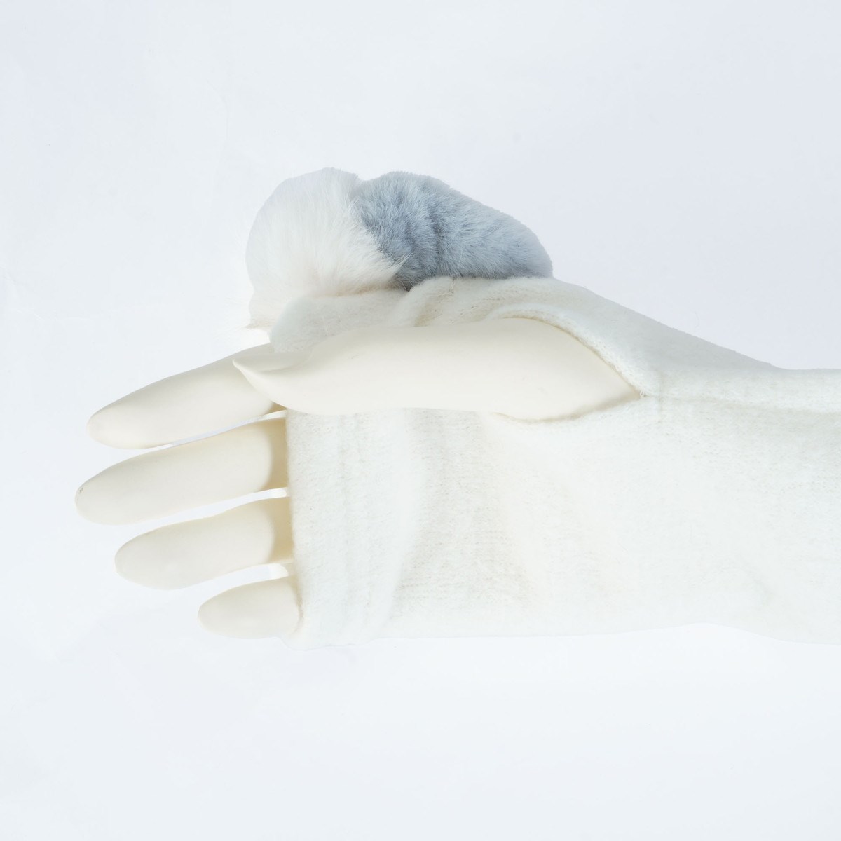 パッチワークされた3色のエコファーがチャーミングなハンドウォーマー。