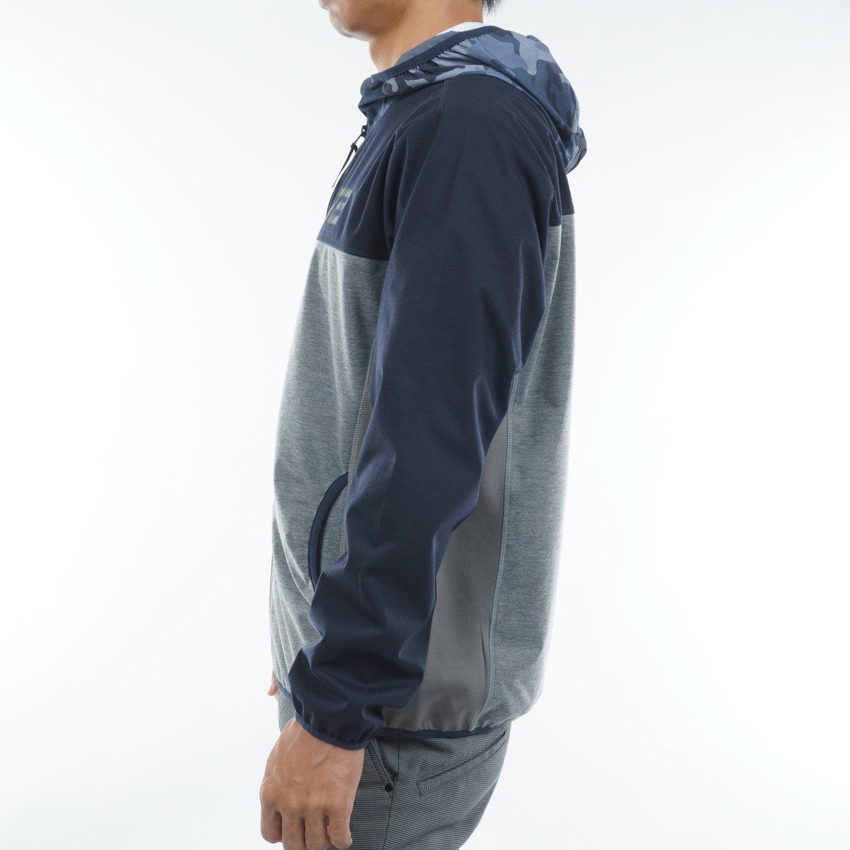 さりげなく施された迷彩柄のフードとロゴが、スタイリッシュなアクセントに。
