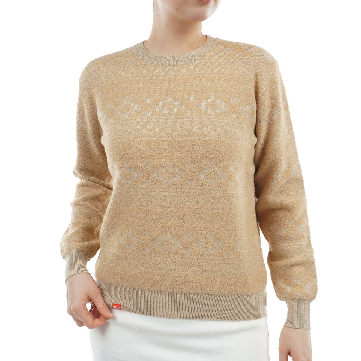 フェザーヤーンをジャカード編みで表現した、立体感のあるオルテガ柄が目を惹くニット。
