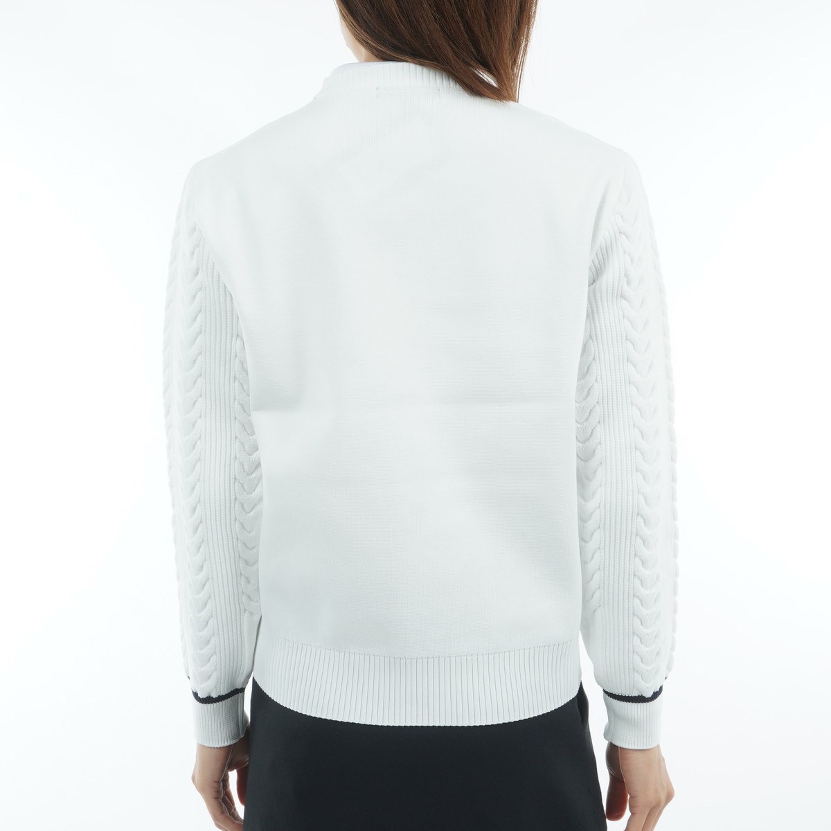 ケーブル編みの袖がアクセントになり、スタイリッシュな印象を与えます。